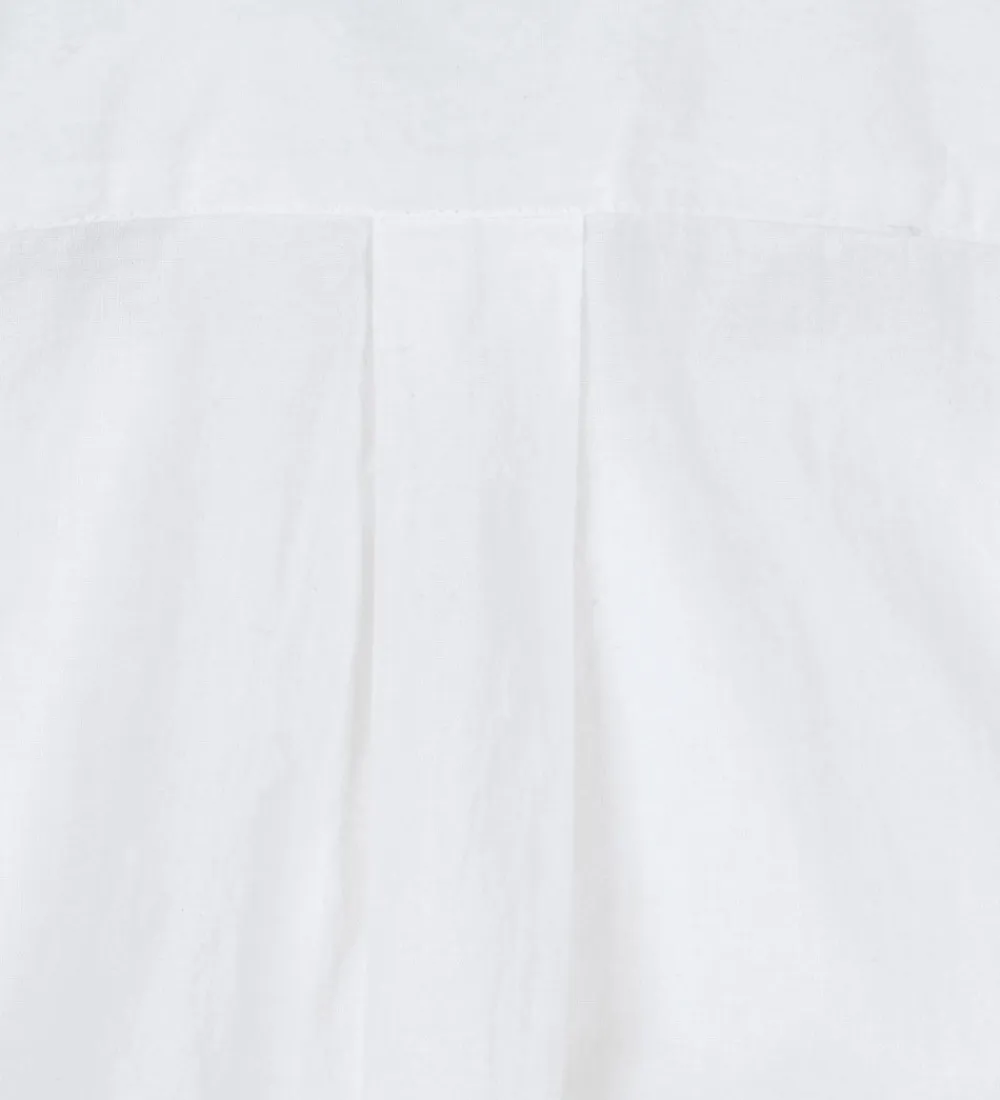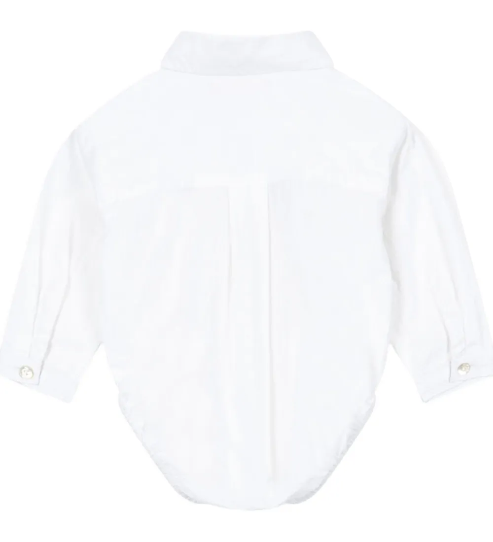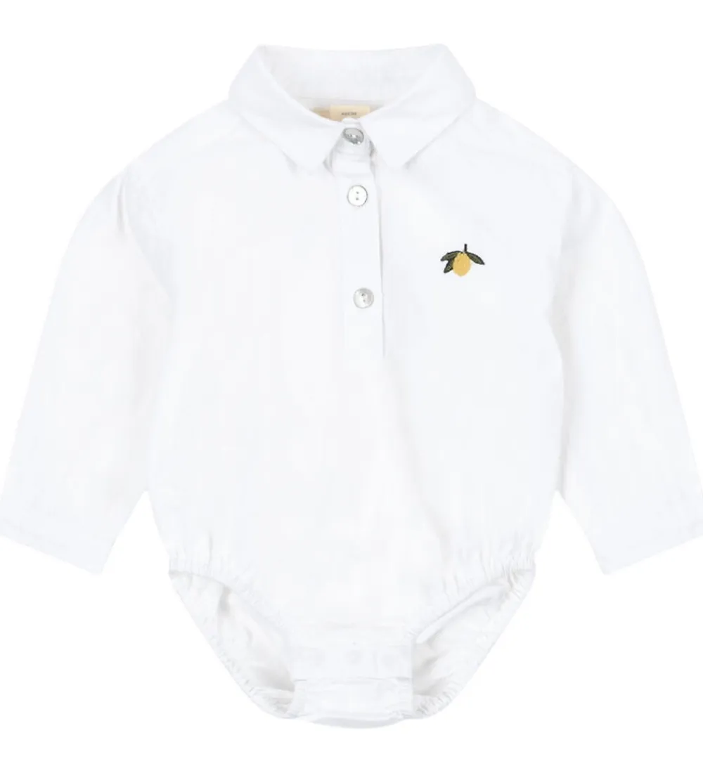 Elegant Konges Sløjd skjortebody i ensfarvet hvid farve. Bodyen har lange ærmer med smalle kanter og en lille knap. I halsåbningen har de en klassisk skjortekrave,og den i toppen med knapper. Mellem benene er der trykknapper. Skjortebodyen har en løs pasform.