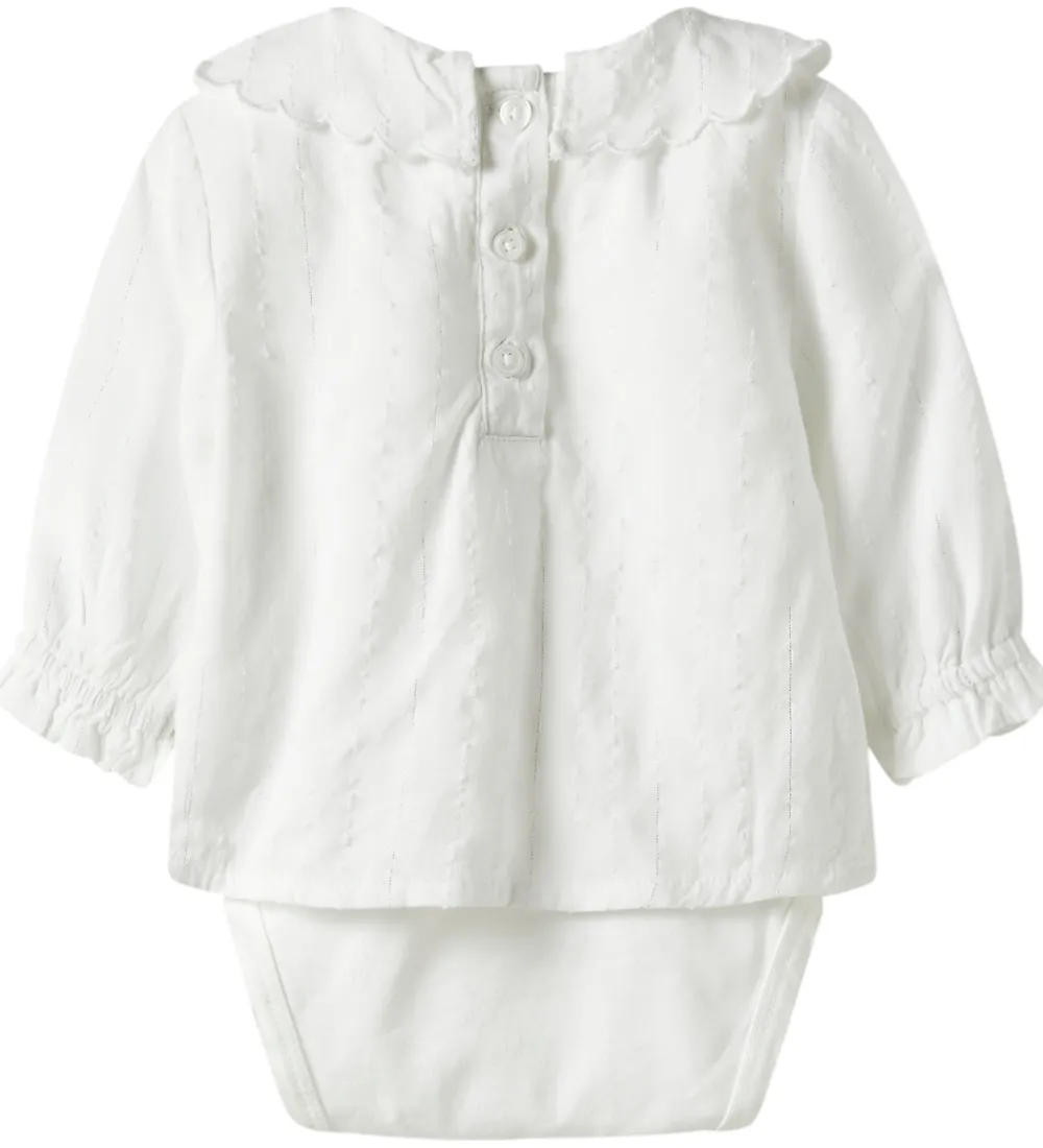 Charmerende Name It skjortebody i hvid med fin struktur og diskrete striber i sølv. Skjortebodyen består af to lag, en body inderst uden ærmer og en skjorte udenpå. Den har en krave med broderi og bølgede kanter, og i nakken er der knapper, så den er let at få over hovedet. Skjortebodyen har lange ærmer med flæser ved håndleddene. Den lukkes mellem benene med trykknapper.