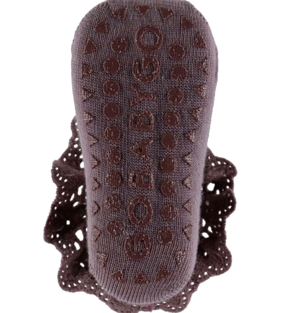 Flotte GoBabyGo skridsikre strømper i lilla med en flot blondeflæse rundt om skaftet.