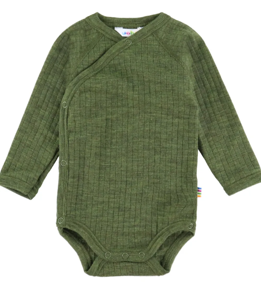 Elegant Joha slå-om body i en smuk, olivengrøn farve med en flot ribstruktur. Slå-om bodyen har lange ærmer og en praktisk slå-om lukning foran, der giver et tidløst udtryk.