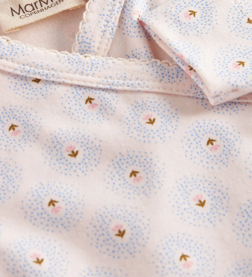 Elegant MarMar slå-om heldragt i en lys cremefarve med et smukt, diskret blomstermønster i lyseblå og rosa. Slå-om heldragten har lange ærmer og ben, der giver et klassisk udtryk.