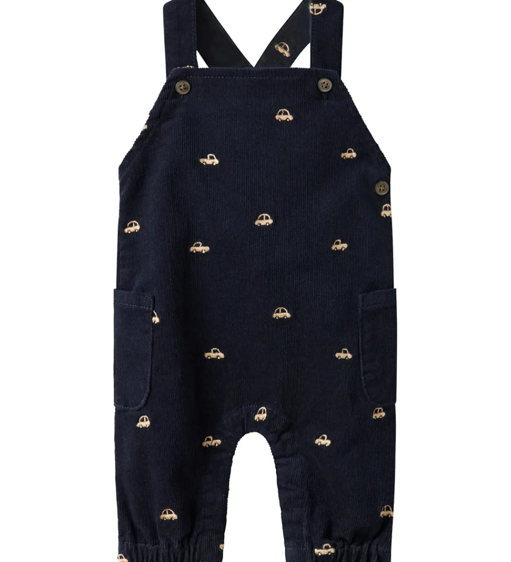 Skønne Name It smækbukser i navyblåt fløjlsvelour med broderede biler i beige.