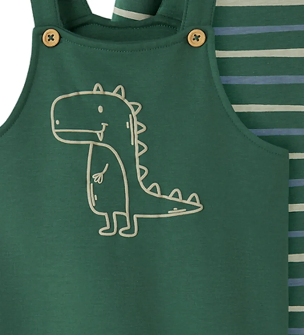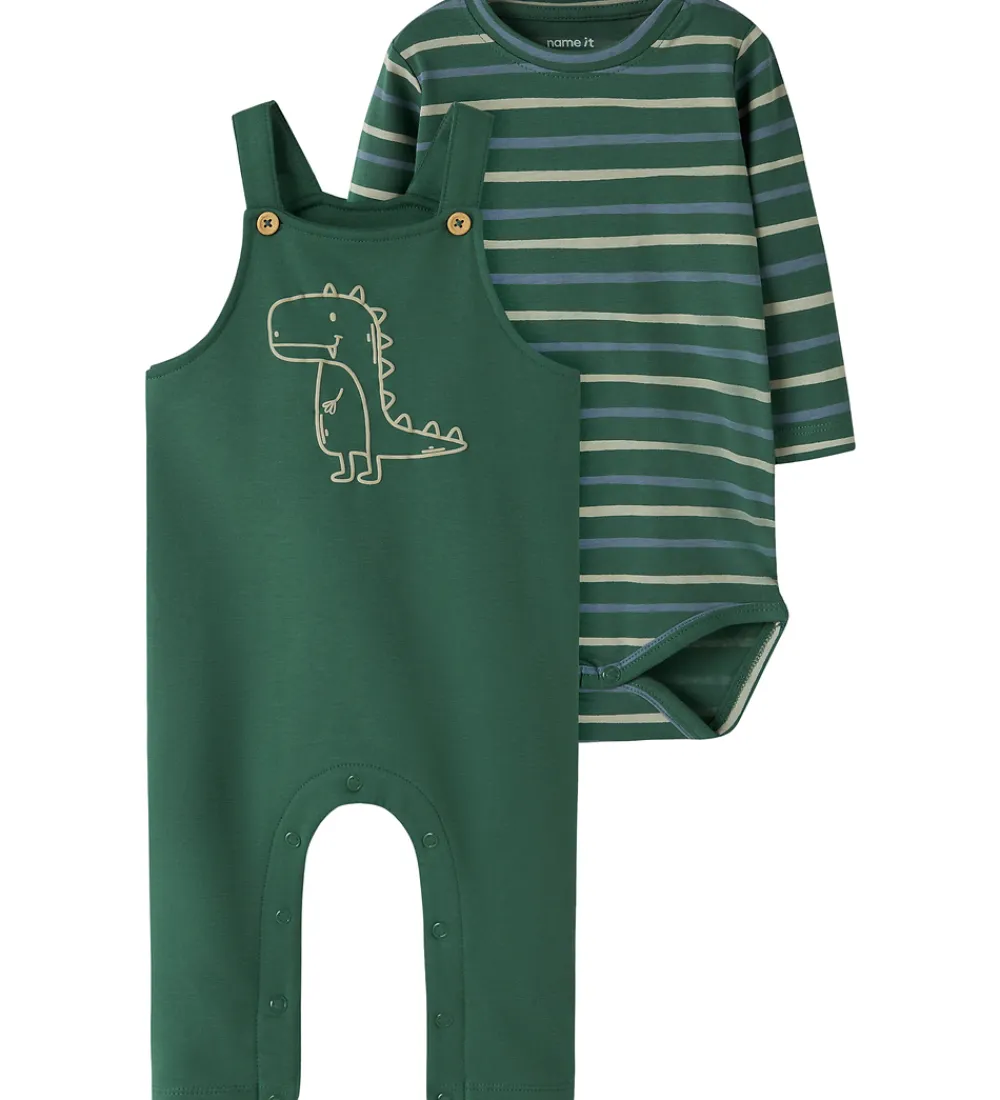 Sødt Name It sæt bestående af et par smækbukser i mørkegrøn med print af en dinosaur på brystet og en body med lange ærmer i mørkegrøn med striber i beige og blå.