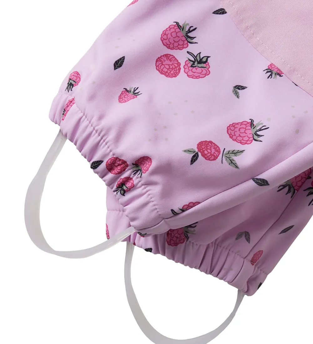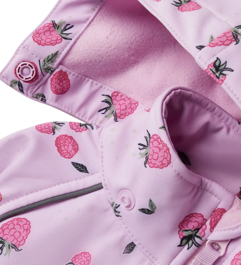 Dejlig Name It softshelldragt i rosa med et alloverprint af hindbær.