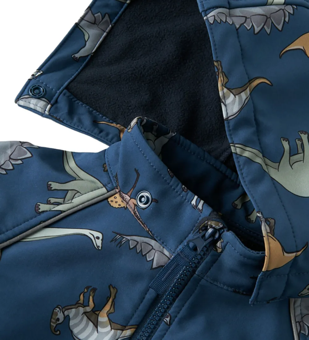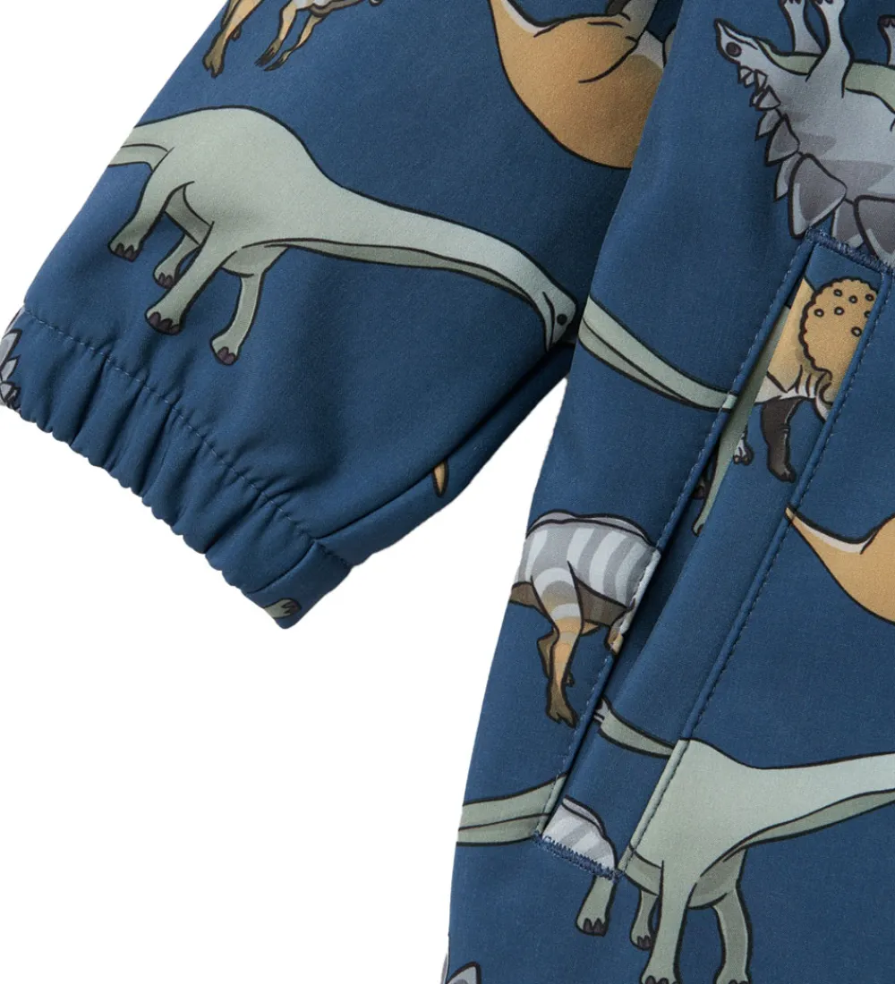 Dejlig Name It softshelldragt i mørkeblå med et alloverprint af dinosaurer i fine farver.