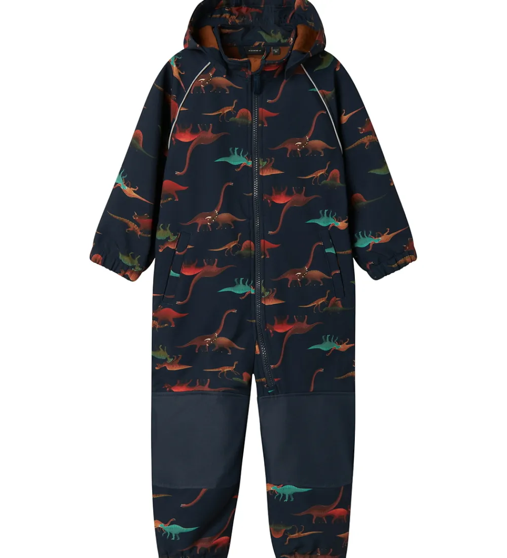 Dejlig Name It softshelldragt i navyblå og med et farverigt print af dinoer. Foret er i en brun nuance.