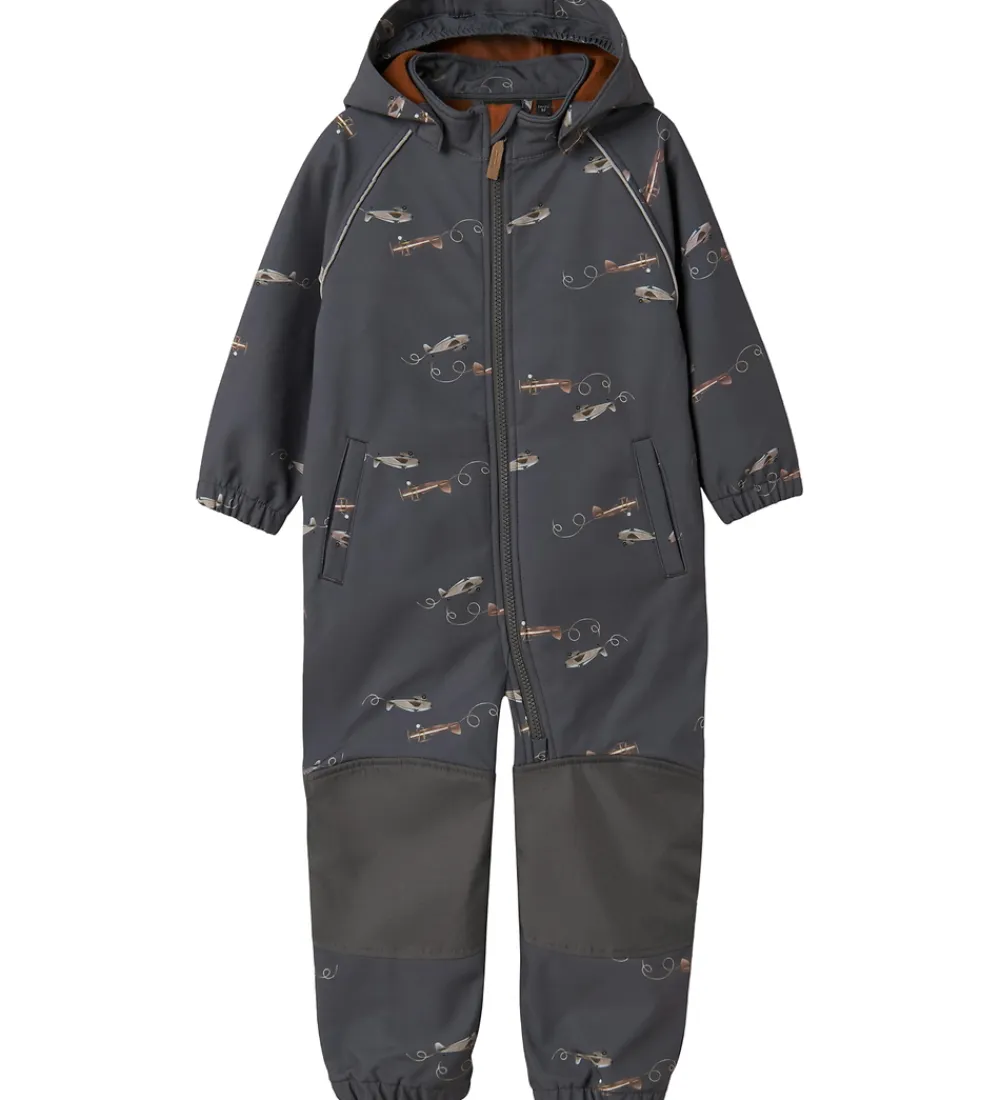 Dejlig Name It softshelldragt i mørkegrå og med print af flyvermaskiner. Foret er i en brun nuance.