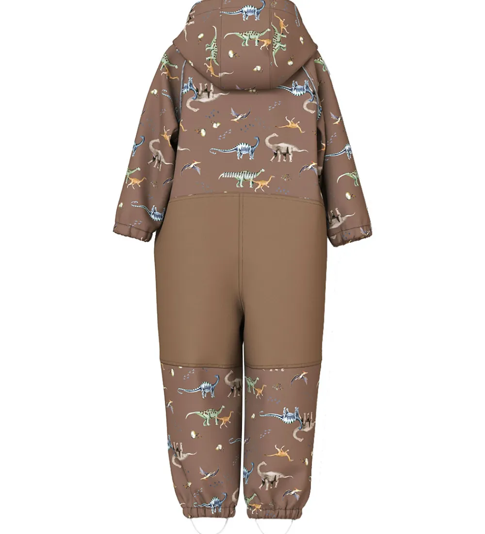 Dejlig Name It softshelldragt i brun med et alloverprint af dinoer i mange farver.