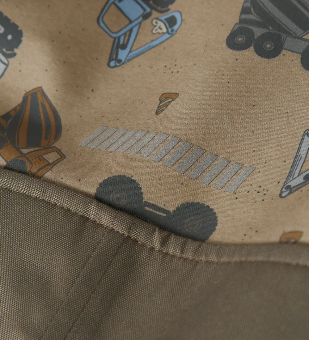 Dejlig Name It softshelldragt i en flot brun nuance med et farverigt print af arbejdsbiler.