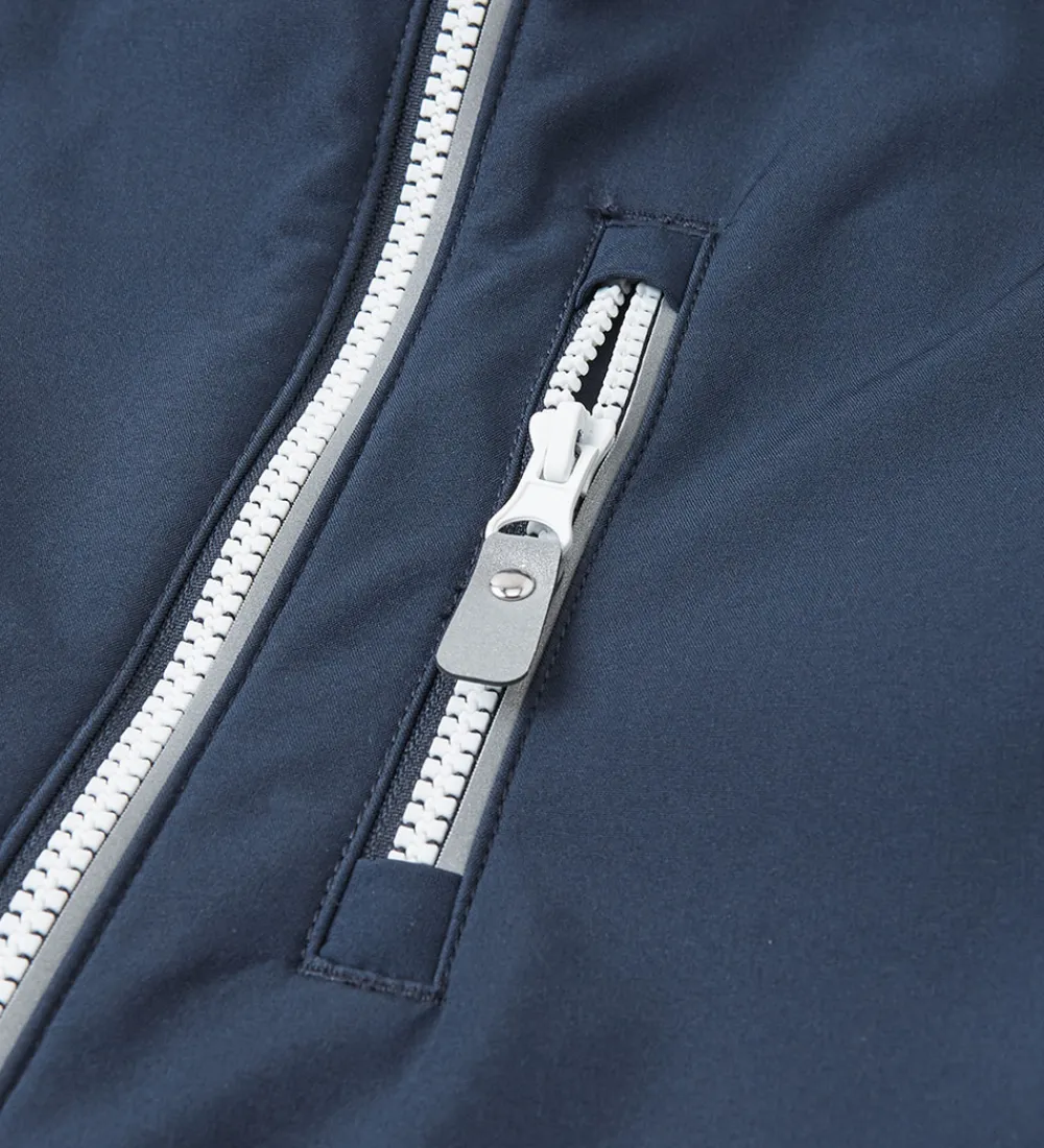 Fin Reima softshelldragt i navyblå med hvide lynlåse, sorte forstærkninger og med et dejligt, blødt fleecefor indvendigt.