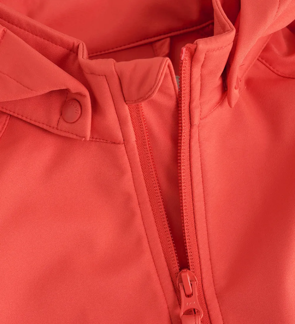 CeLaVi softshelljakken har en aftagelig hætte, som sidder fast med trykknapper, og den har smalle elastikkanter.
