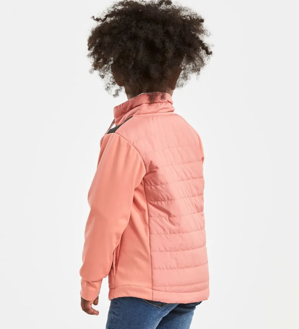 Lækker Didriksons softshelljakke i koralrosa med sorte skulderstykker. Softshelljakken er en hybrid mellem softshell og termo. Jakkens krop er vatteret og med vandrette syninger som en termojakke, mens ærmerne er klassisk softshell.