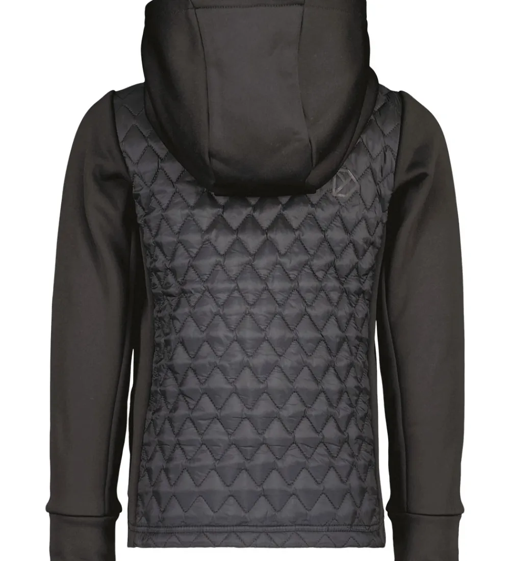 Lækker Didriksons softshelljakke i sort. Kroppen er i et glatvævet materiale med en bølgende, quiltet struktur, mens resten er i softshell.