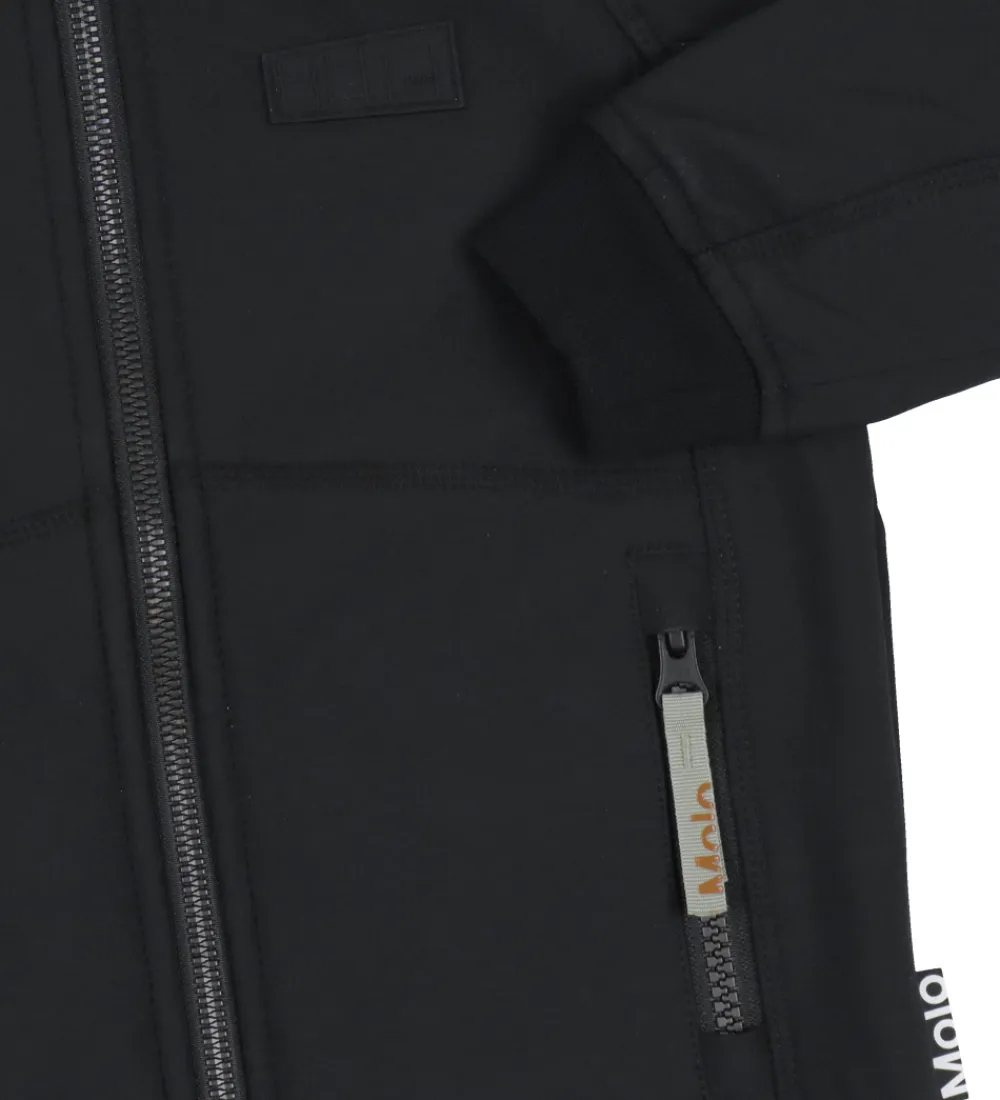Molo softshelljakken har brede ribkanter, og den åbnes med en lynlås med hagebeskytter og indvendig vindstolpe. I siderne er der praktiske, fleeceforede lommer, som lukkes med en lynlås. Softshelljakken er foret med blødt fleece i brun. Nederst på ryggen er der et praktisk refleksprint.