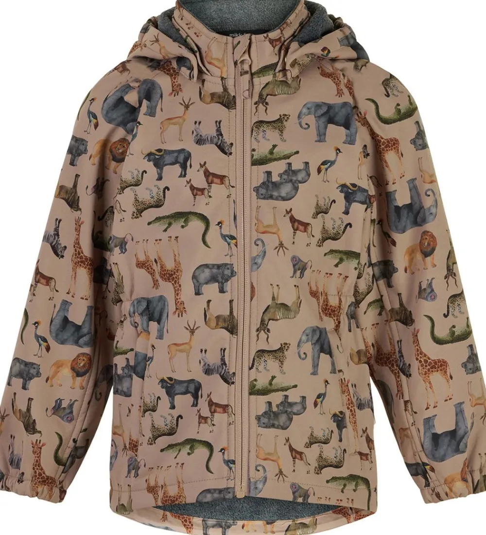 Fed Mikk-Line softshelljakke i lysebrun med et med et alloverprint af savannedyr i flere farver.