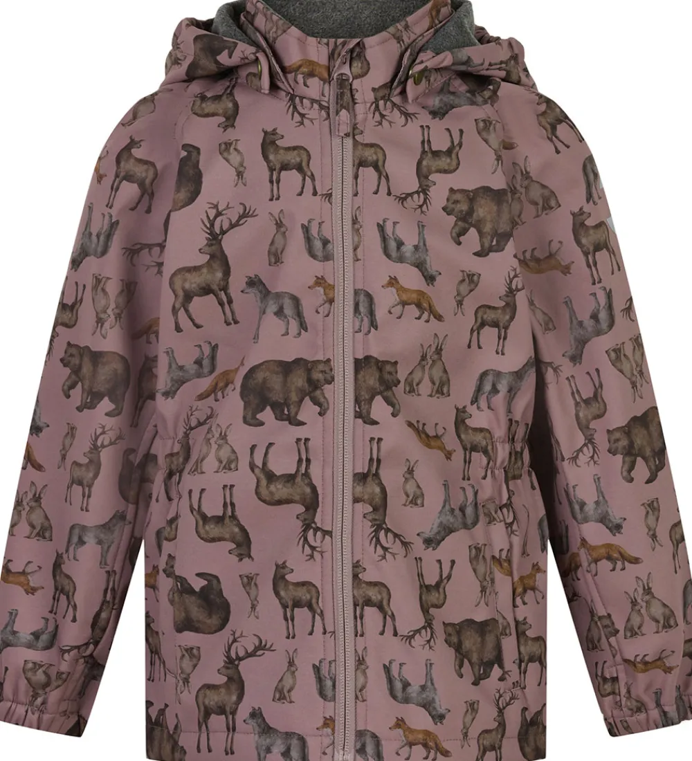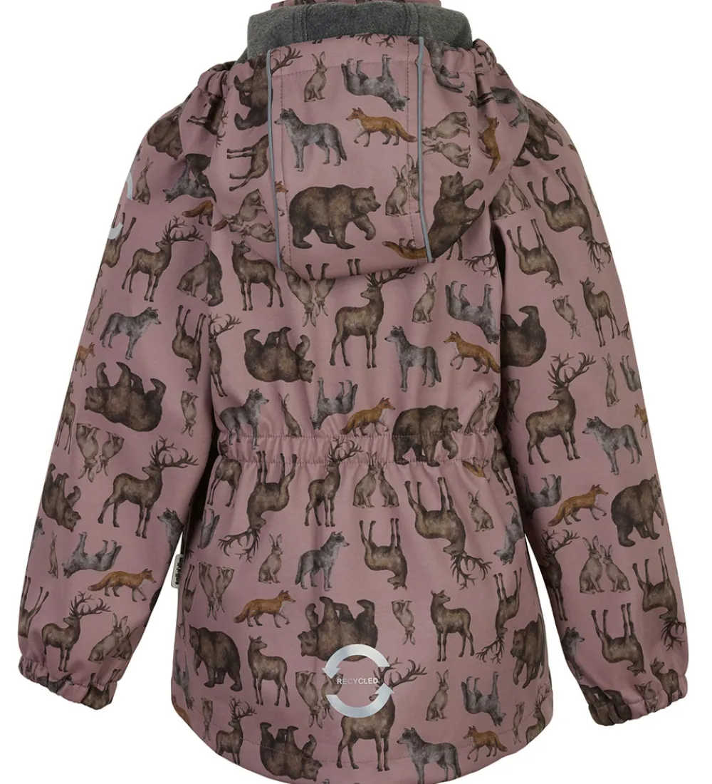 Fed Mikk-Line softshelljakke i mørk, støvet rosa med et med et alloverprint af nordiske skovdyr i afdæmpede nuancer.