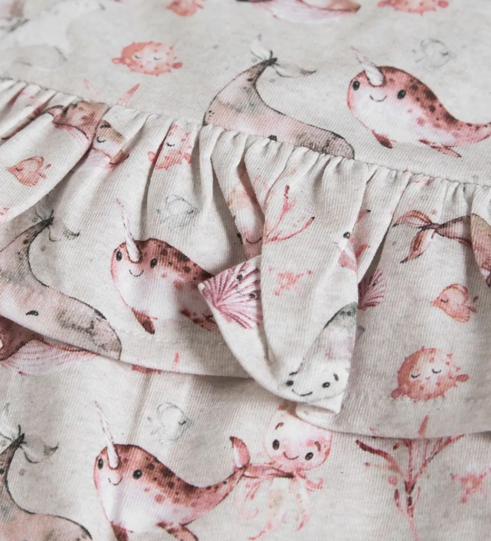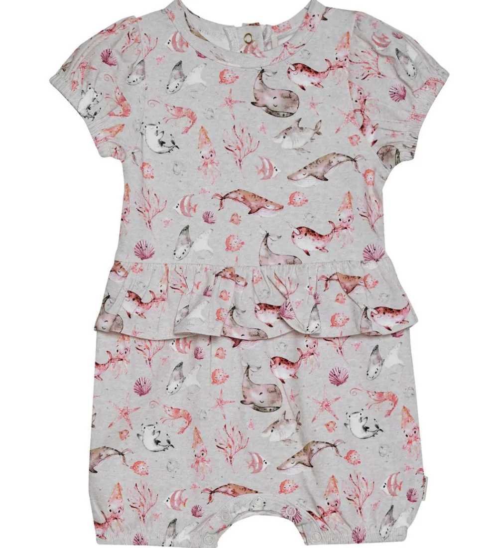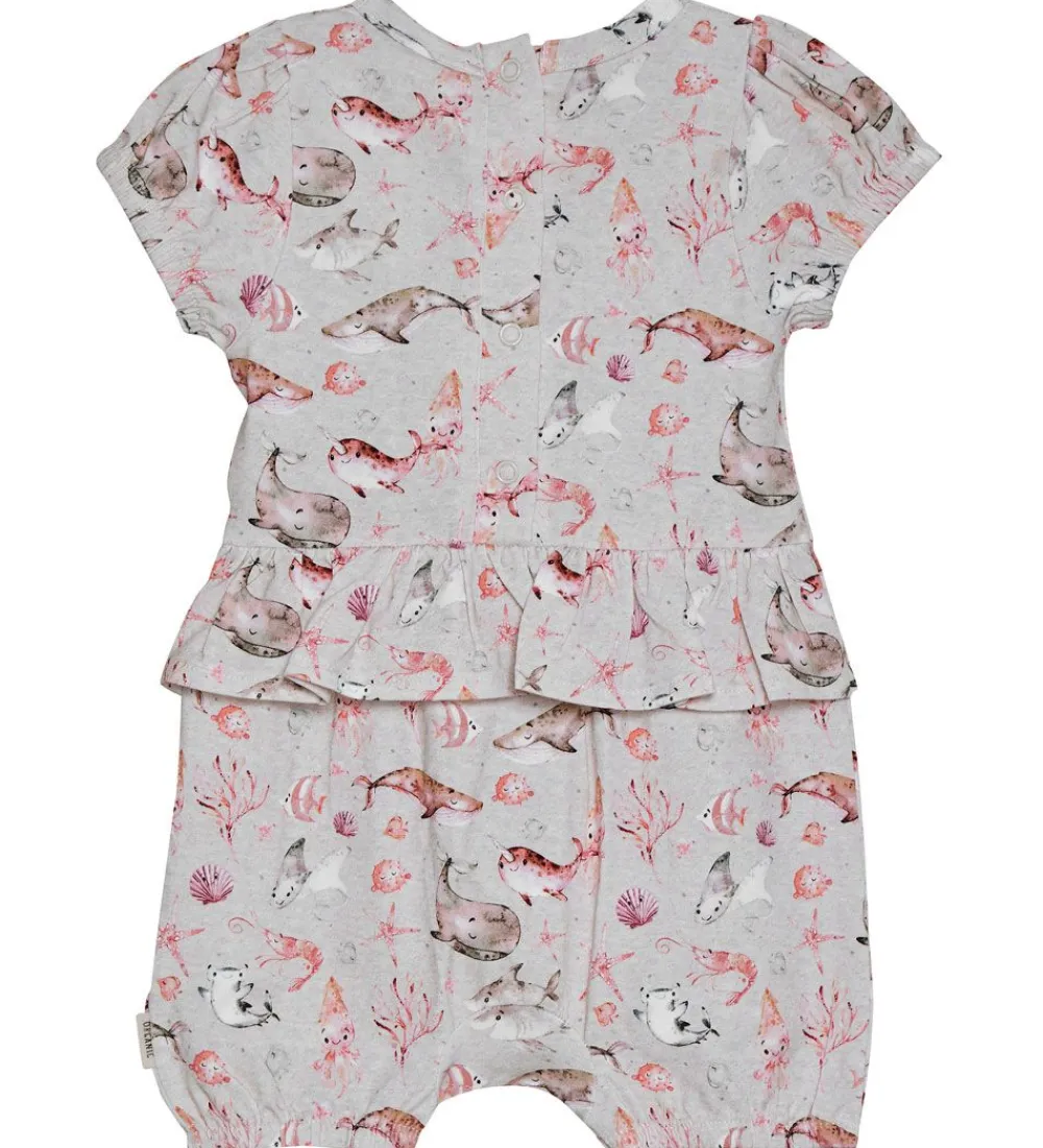 Sød Minymo sommerdragt i beige med et alloverprint af fisk, hajer og andre ting fra havet i rosa, grå og brune nuancer.