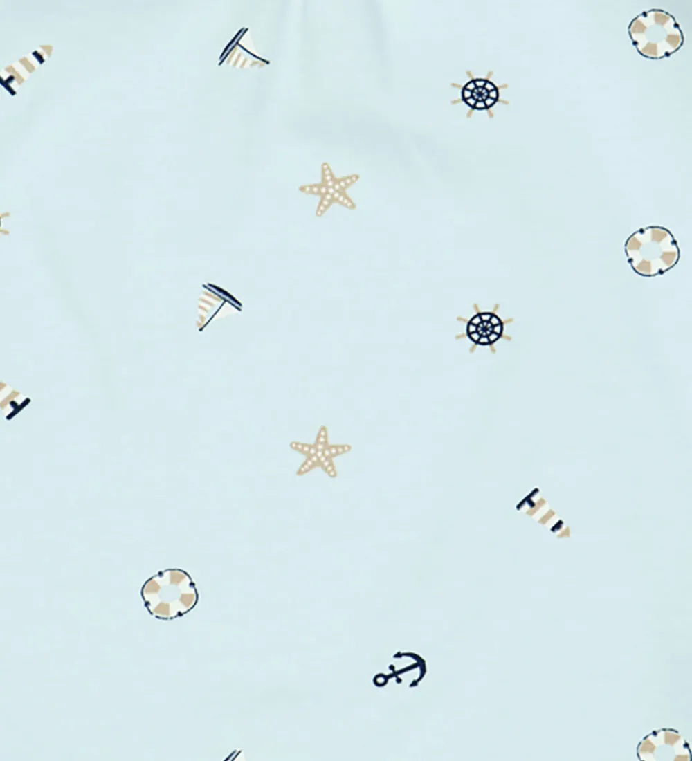Dejlig Müsli sommerdragt i en lyseblå nuance med korte ærmer og praktiske trykknapper. Sommerdragten har et fint maritimt print med ankre, stjerner og fyrtårne, der skaber et charmerende udtryk. Perfekt til afslappende sommerdage.