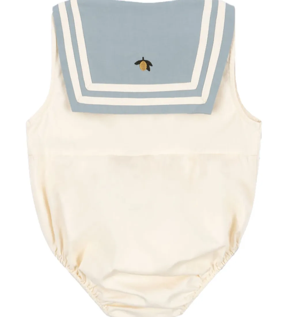 Hyggelig Konges Sløjd sommerdragt i en beige nuance med smukke striber i kraven som er sømandsinspireret. Sommerdragten har knaplukning foran og mellem benene for nem påklædning og giver en let pasform til de små.