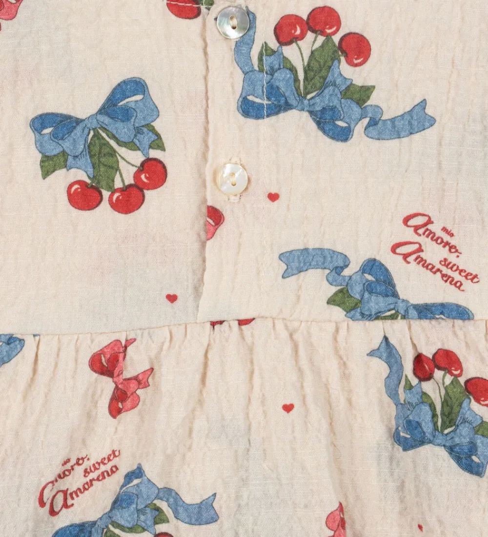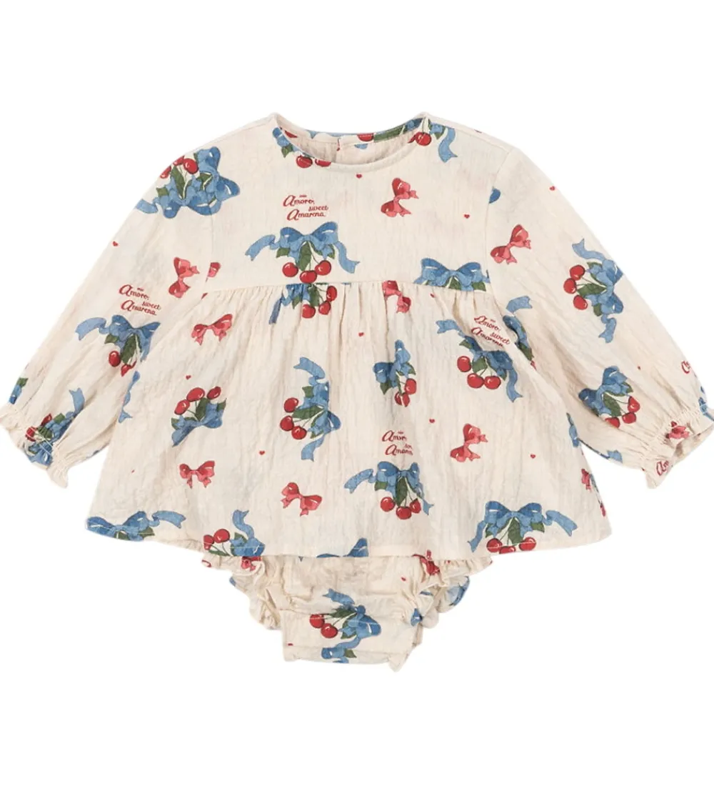 Delikat Konges Sløjd sommerdragt i en lysebeige nuance med et charmerende print af kirsebær og blå sløjfer i blå og røde nuancer.