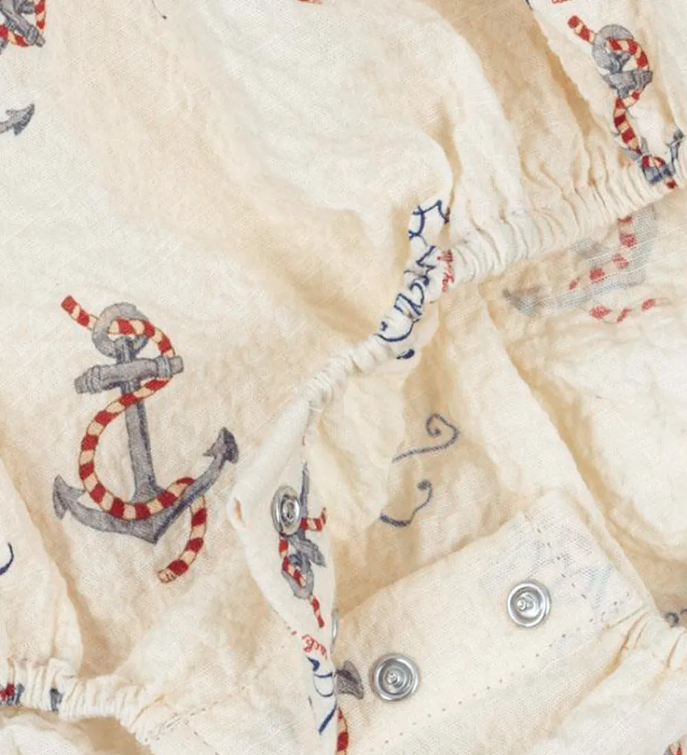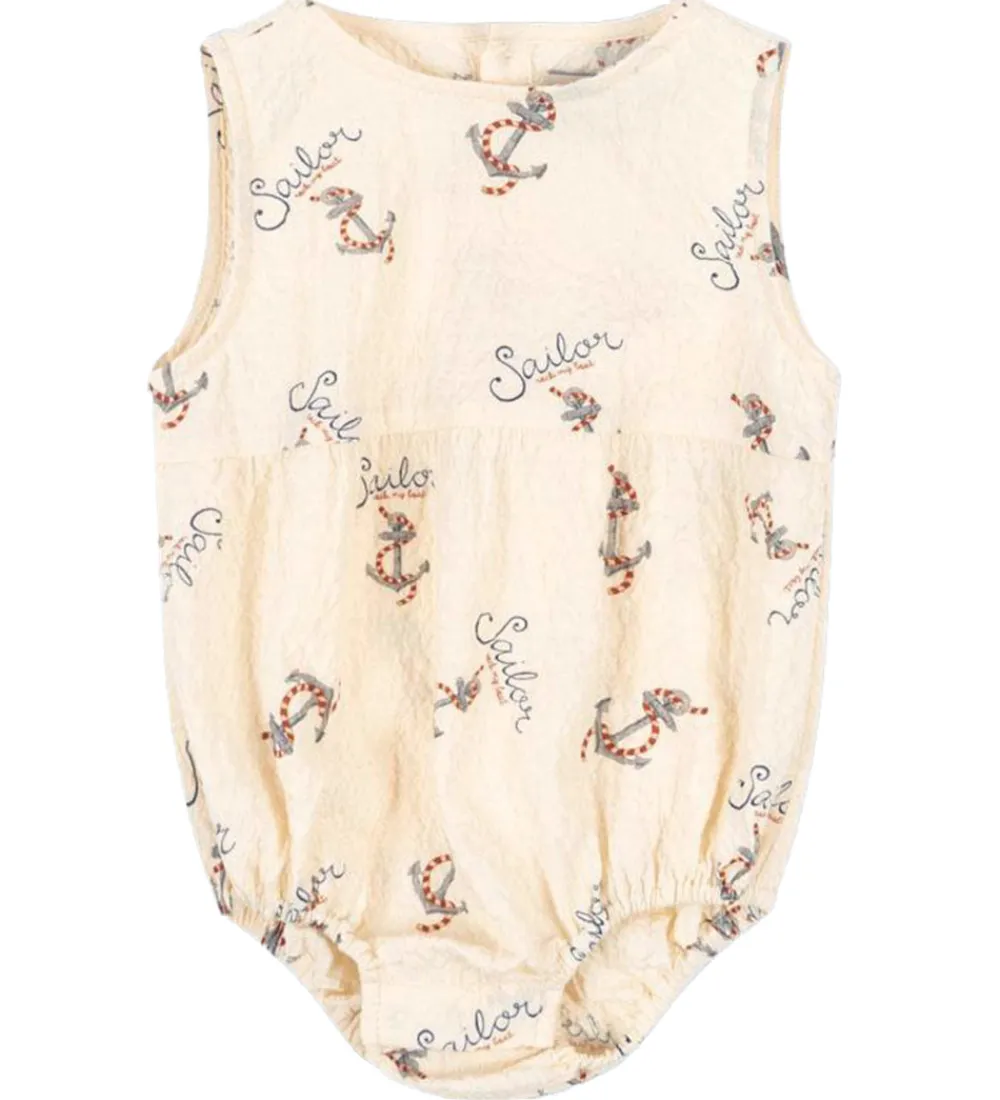 Fin Konges Sløjd sommerdragt uden ærmer i en råhvid farve med et iøjnefaldende anker- og tekstprint. Sommerdragen har en let pasform, der giver fri bevægelse til små eventyrere.