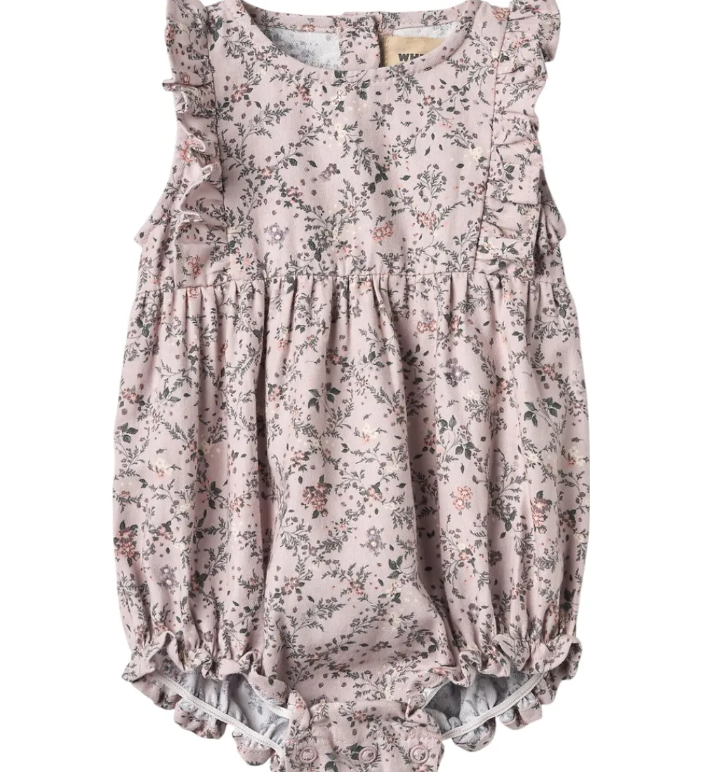 Elegant Wheat sommerdragt i en sart lilla med et fint blomsterprint. Sommerdragten er uden ærmer og ben, og over skuldrene har den flotte flæser. Den åbnes på ryggen med træknapper, samt mellem benene med praktiske trykknapper.