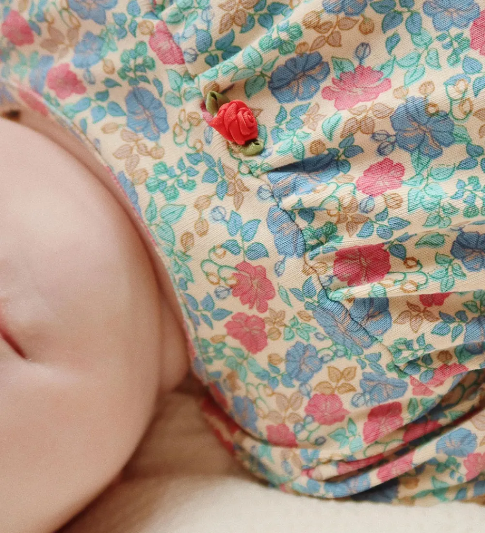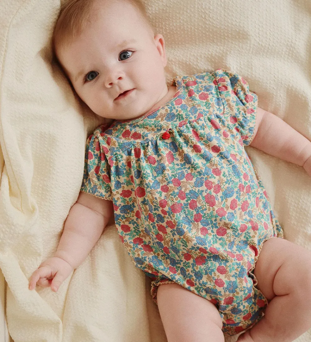 Farverig Konges Sløjd sommerdragt med et smukt blomsterprint i blå, rød og beige nuancer. Sommerdragten har korte ærmer og en rund halsudskæring, der fuldender et klassisk look. Trykknapper mellem benene gør påklædningen lettere.