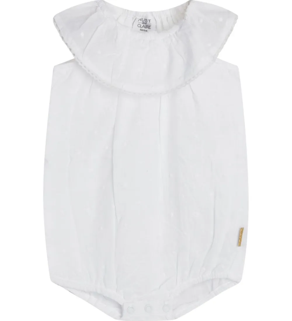 Yndig Hust and Claire sommerdragt i hvid med dekorative broderinger og fin flæsekrave.