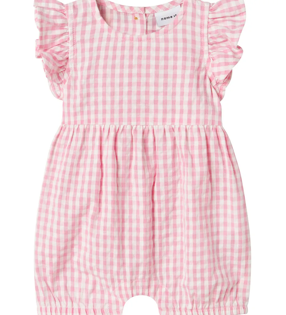 Charmerende Name It sommerdragt i lyserød og hvid med et ternet mønster. Name It dragten har korte ærmer med søde flæser, som giver et fint og let udtryk.