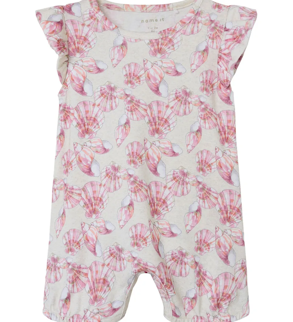 Name It sommerdragten har dekorative vingekanter langs ærmegab, som udgør et lille ærme og korte ben med behagelige elastikkanter. Sommerdragten åbnes med skjulte trykknapper over venstre skulder samt mellem benene med almindelige trykknapper og er lavet i en blød og strækbar kvalitet.