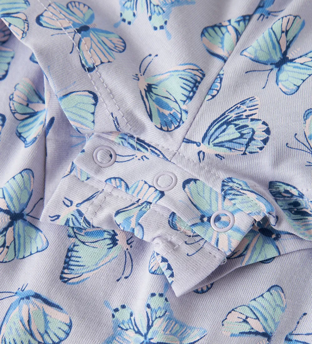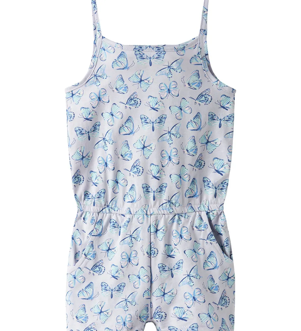 Fin Name It sommerdragt i lys lilla med et alloverprint af sommerfugle. Sommerdragten har smalle skulderstropper og en elastik omkring taljen. I siderne er der lommer. Sommerdragten har korte ben og lukkes mellem benene med trykknapper.