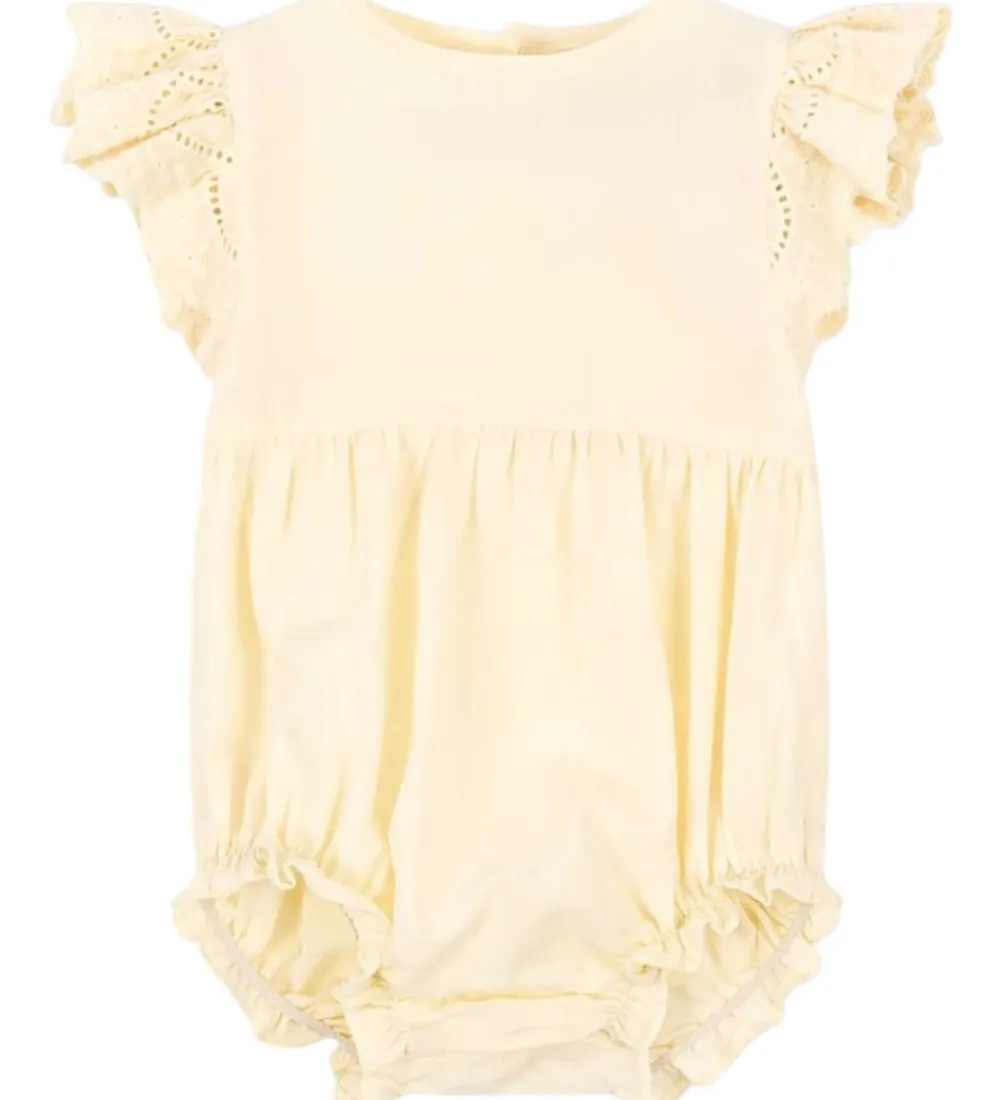 Sommerdragten har fine, korte flæseærmer med broderede detaljer, der skaber et elegant udtryk. Modellen har en rummelig pasform med elastikbånd ved benene og praktiske trykknapper i mellem benene for nem påklædning.