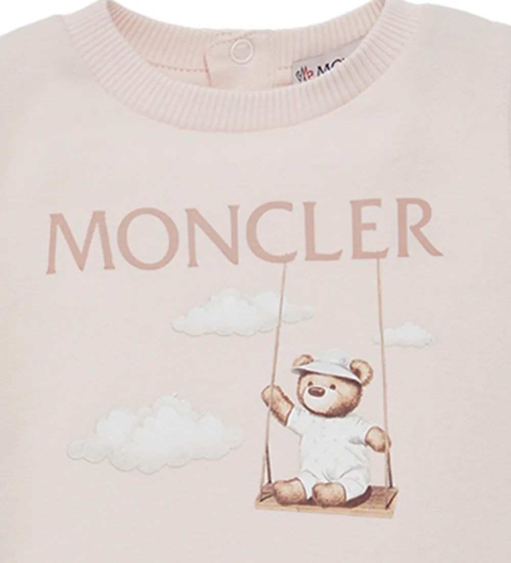 Sød Moncler sommerdragt i lys rosa sweat, og fortil er der et print i hvid og brun med en bamse med tøj på, som sidder på en gynge og med bløde skyer omkring sig. Ovenover står der “Moncler” trykt i rosa.