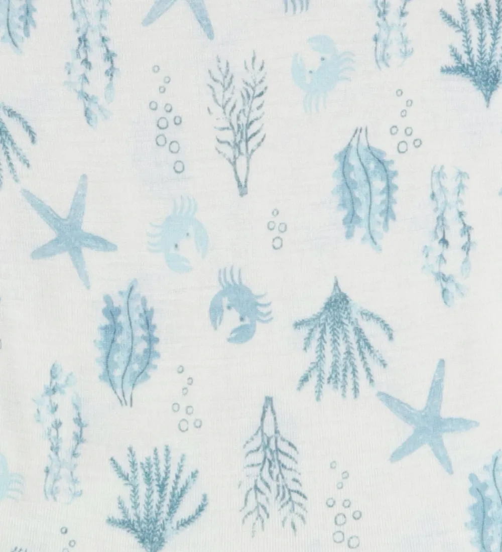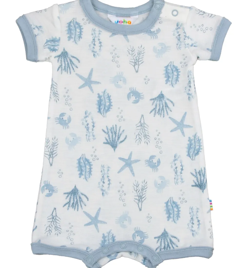 Skøn Joha sommerdragt i hvid med et fint havprint, der inkluderer krabber, søstjerner og tang i blå nuancer. Perfect til varme dage og leg.
