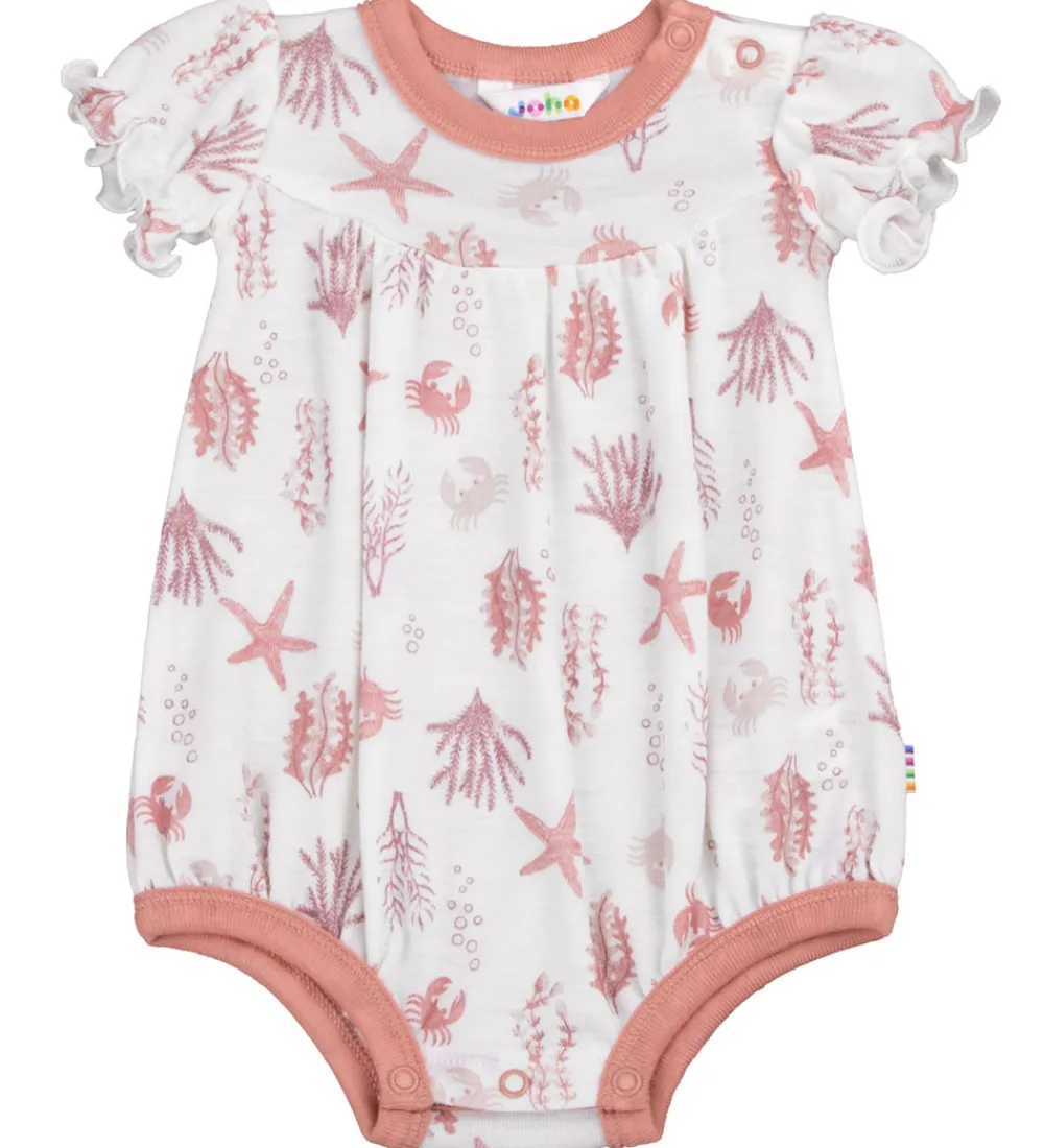 Lækker Joha sommerdragt i hvid med et fint havprint af krabber, søstjerner og tand i rosa nuancer. Det bløde design sikrer komfort til de mindste i det varme vejr.