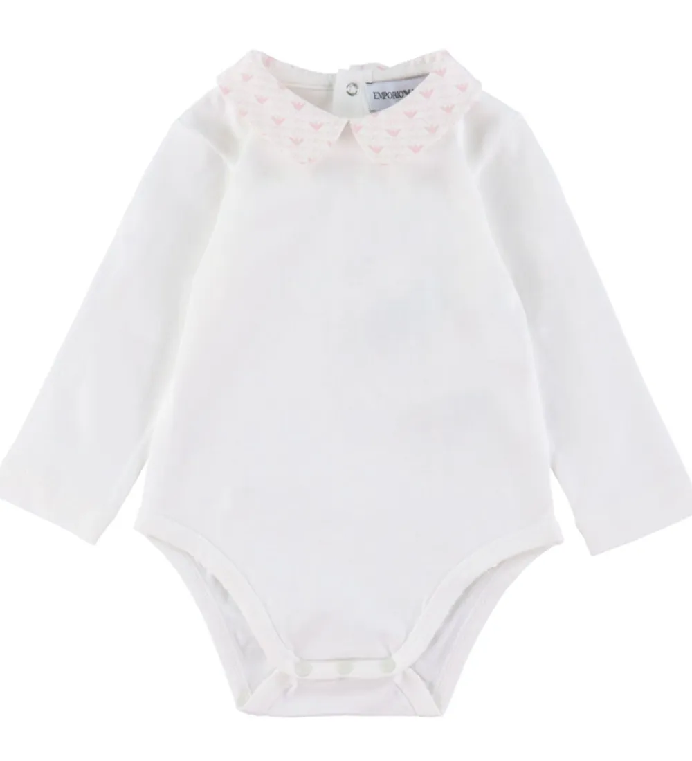 Sødt Emporio Armani sæt der består af en sparkedragt og en body. Sparkedragten er lys rosa med et alloverprint med logoer i en mørkere nuance, og bodyen er hvid, mens den på kraven har samme mønster som sparkedragten.