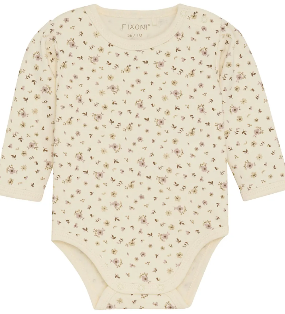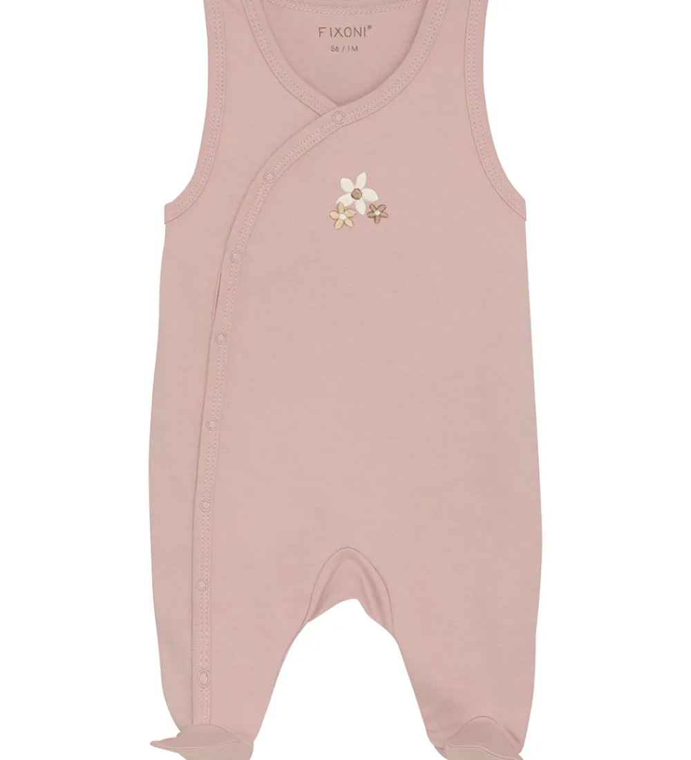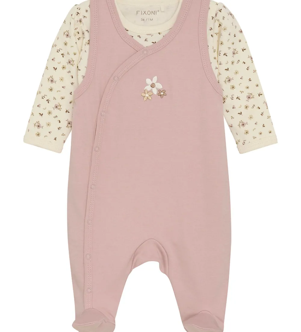 Sød Fixoni sparkedragt og body. Sparkedragten er rosa med broderede blomster i hvid og brun fortil, og bodyen er hvid med et alloverprint med blomster i rosa nuancer.