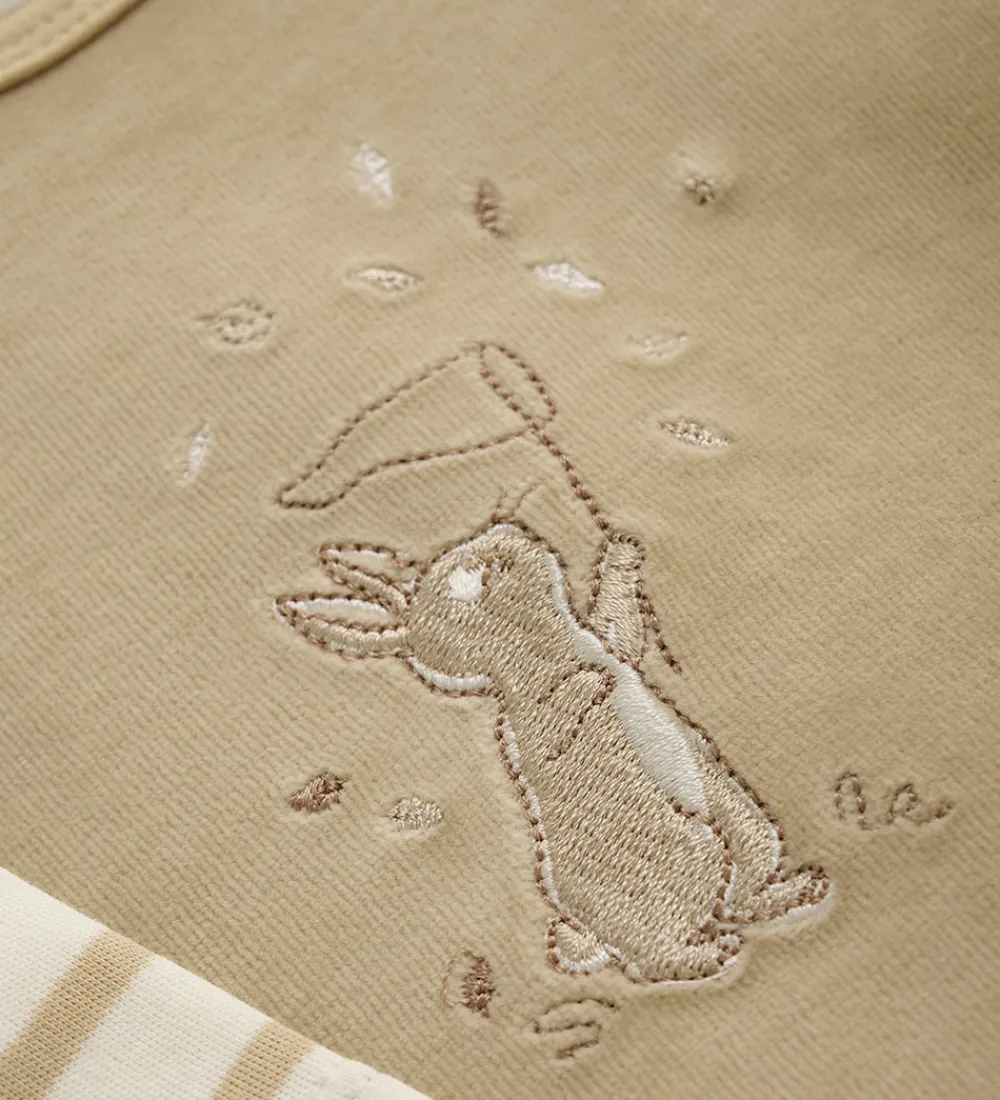 Lækker Fixoni sparkedragt og body. Sparkedragten er lysebrun og lavet af velour, og fortil er der broderet en lysebrun kanin. Bodyen er hvid med smalle, vandrette striber i lysebrun.