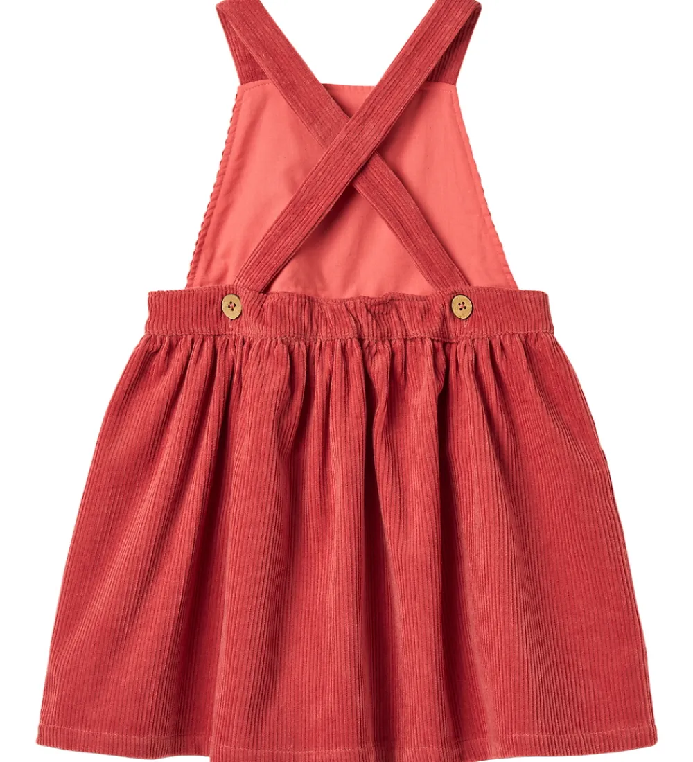 Elegant Wheat spencer i rødt fløjl, og på brystet er der et fint blomsterbroderi. Kjolen har brede skulderstropper, som krydser opå rygge, og de kan justeres i to længder med en knap på ryggen. I lænden er der en bred elasttikkant, og skørtet har masser af vidde. I siderne er der praktiske lommer.
