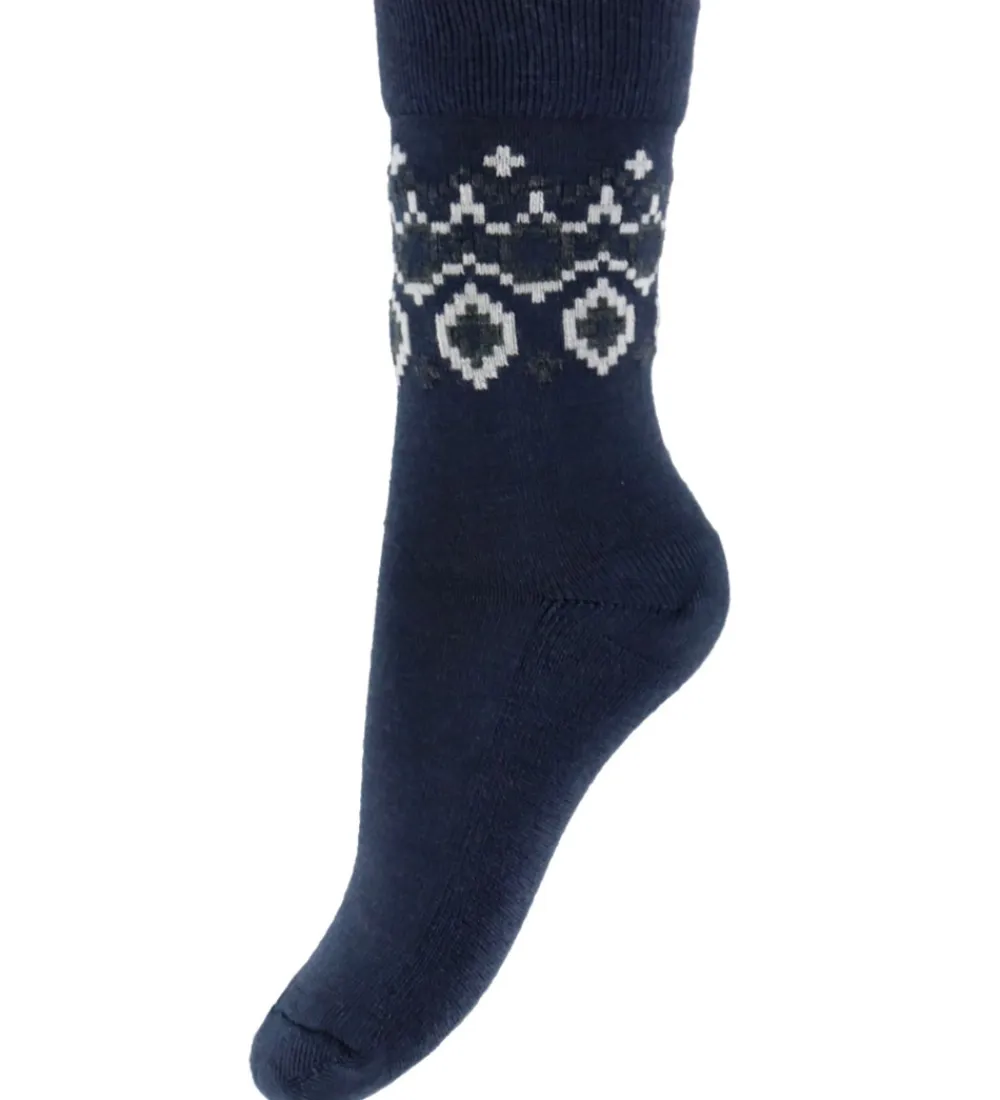 Elegante MP strømper i en klassisk, mørkeblå nuance prydet med et stilfuldt mønster i hvide og grønne nuancer.
