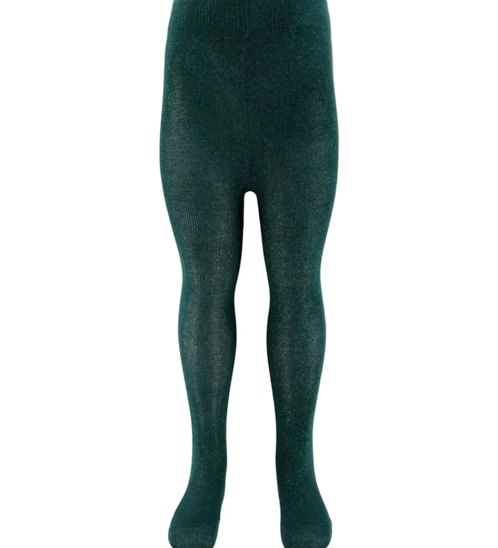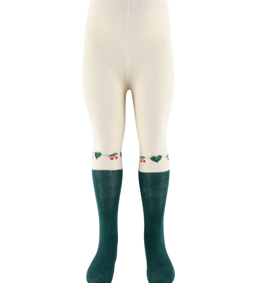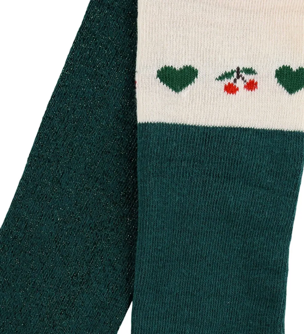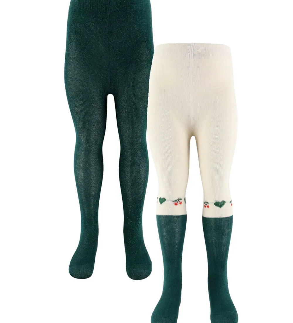 Stilfulde Konges Sløjd strømpebukser i en 2-pak. Strømpebukserne består af et par i mørkegrøn med glimmer og et i hvid med dekorative små grønne og røde detaljer. Begge par har en fin elastisk talje for en optimal pasform.
