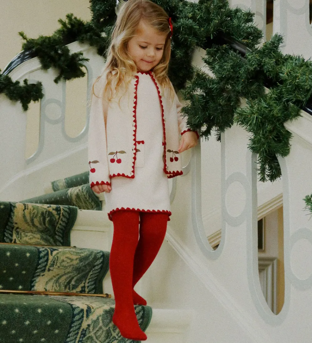 Praktiske Konges Sløjd strømpebukser solgt i en 2-pak. Den ene er i ensfarvet rød, mens den anden er hvid med blå ben og små, farvede hjerter samt dobbelte striber omkring anklerne. Begge par har en elastisk talje for en behagelig pasform.