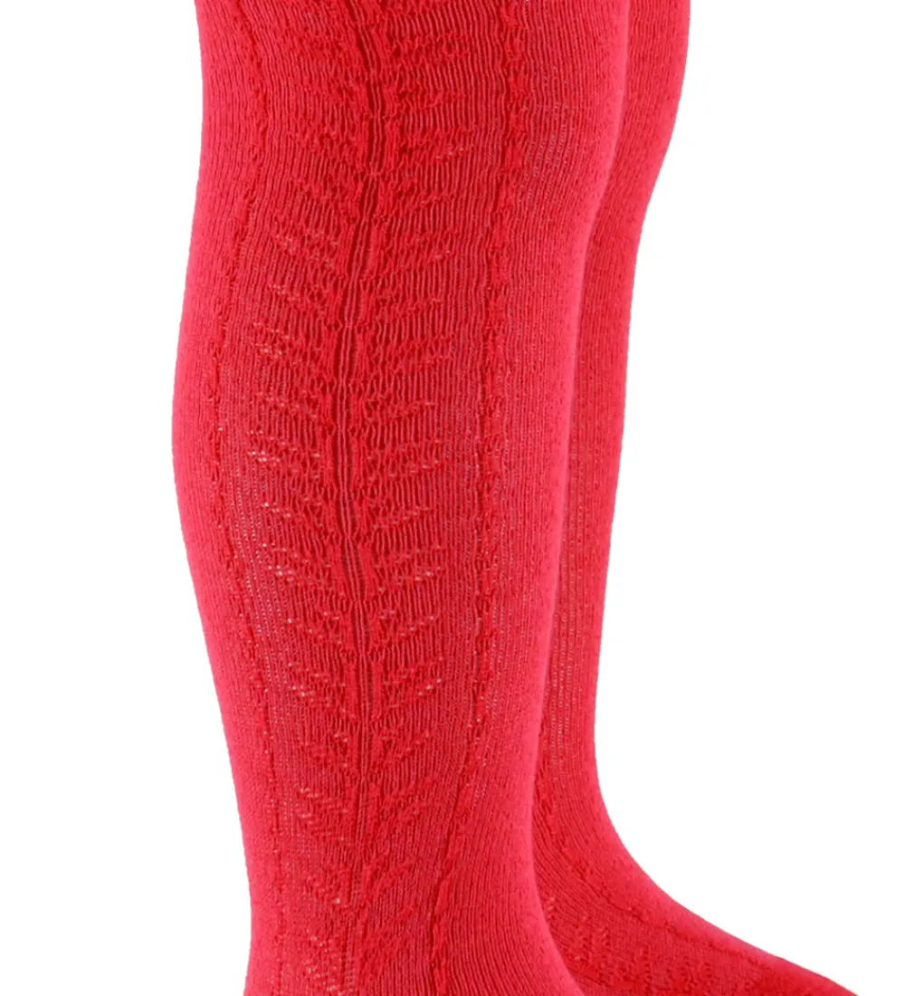 Fine MiniPop strømpebukser i en iøjnefaldende rød farve med et dekorativt hulmønster ned ad buksebenene. Strømpebukserne har en ribbet struktur øverst, mens resten er glatvævet. Den elastiske talje sikrer en god pasform.
