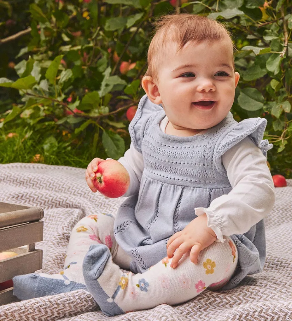 SødeHust and Claire strømpebukser i hvide med blomster i pastelnuancer og med lyseblå kanter.