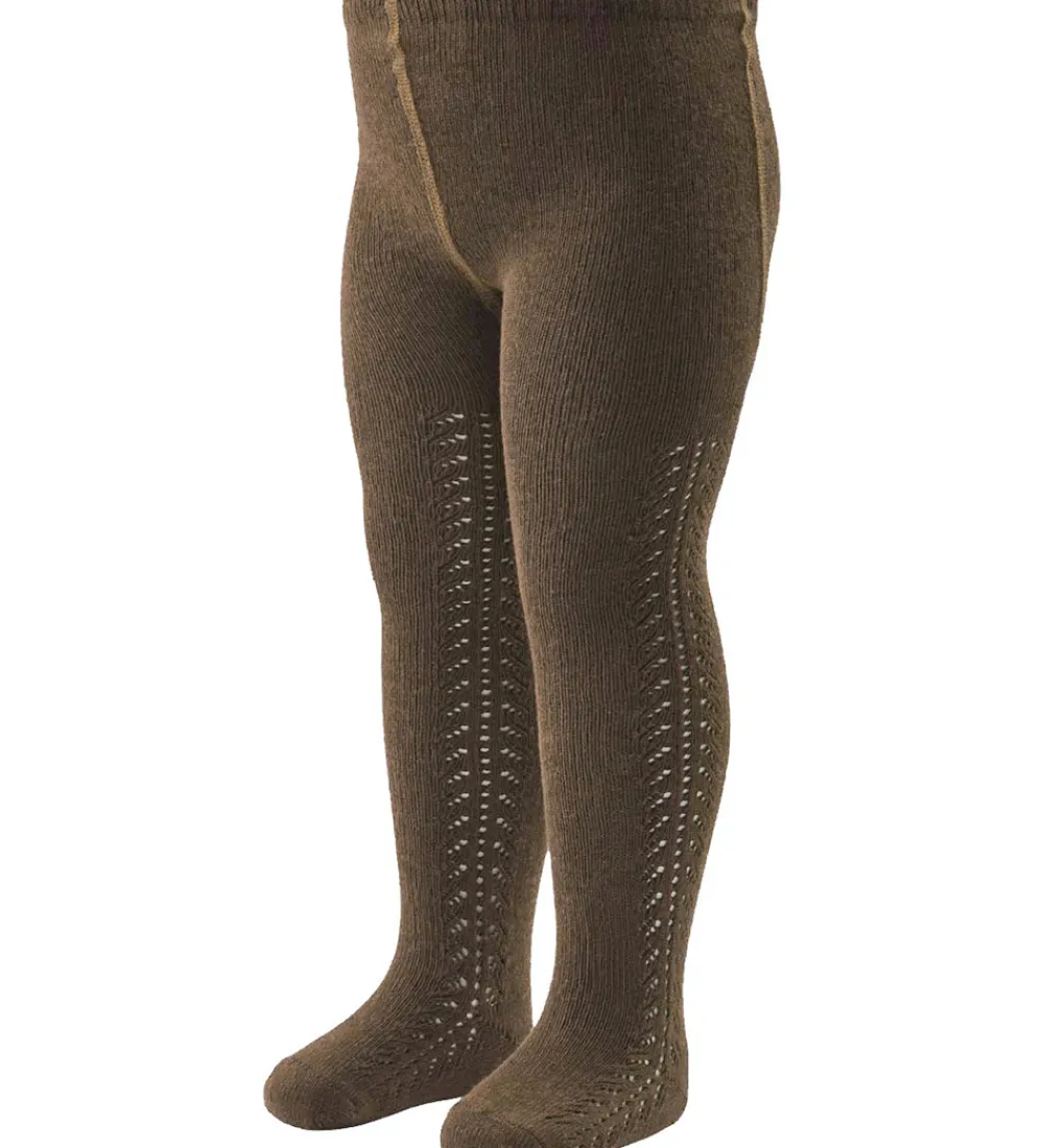 Fine Müsli strømpebukser i ensfarvet brun med et smukt hulmønster langs siderne.