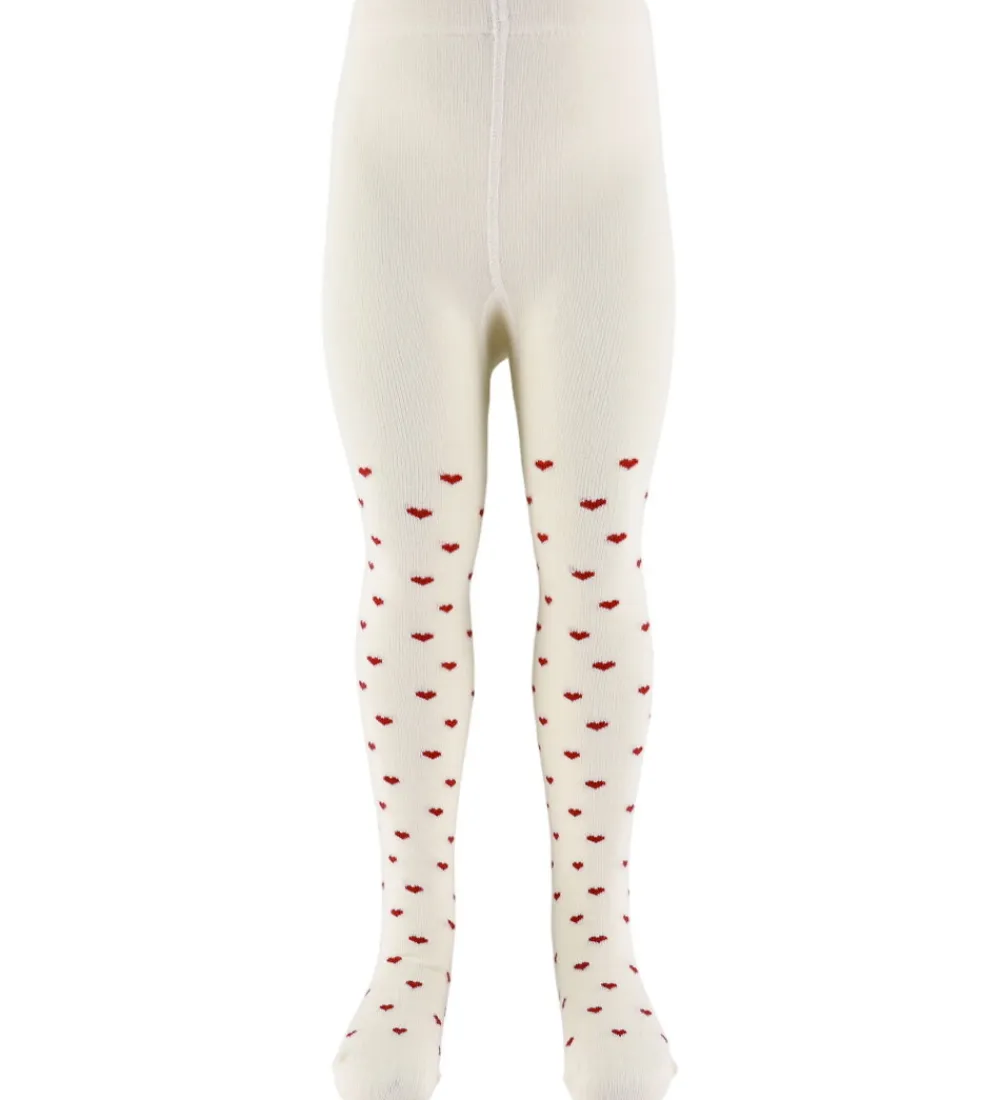 Fine Lil Atelier strømpebukser i hvid med print af små, røde hjerter. Strømpebukserne har en glat struktur og en elastisk talje, der giver en god pasform.