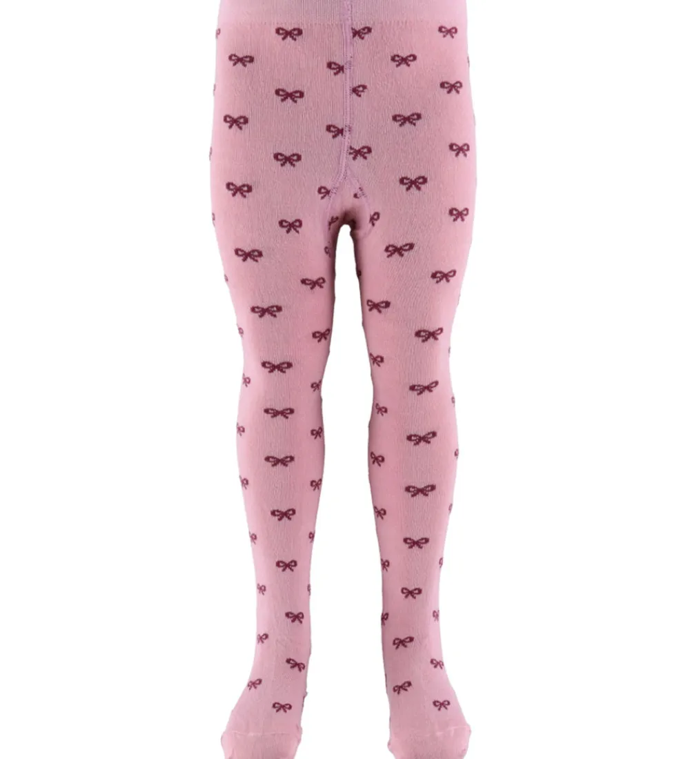 Søde Fuzzies strømpebukser i rosa med et print med små bordeauxrøde sløjfer.