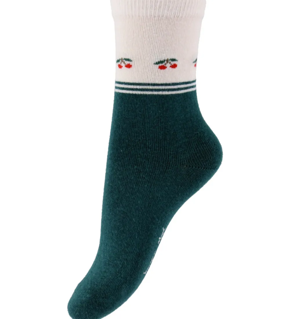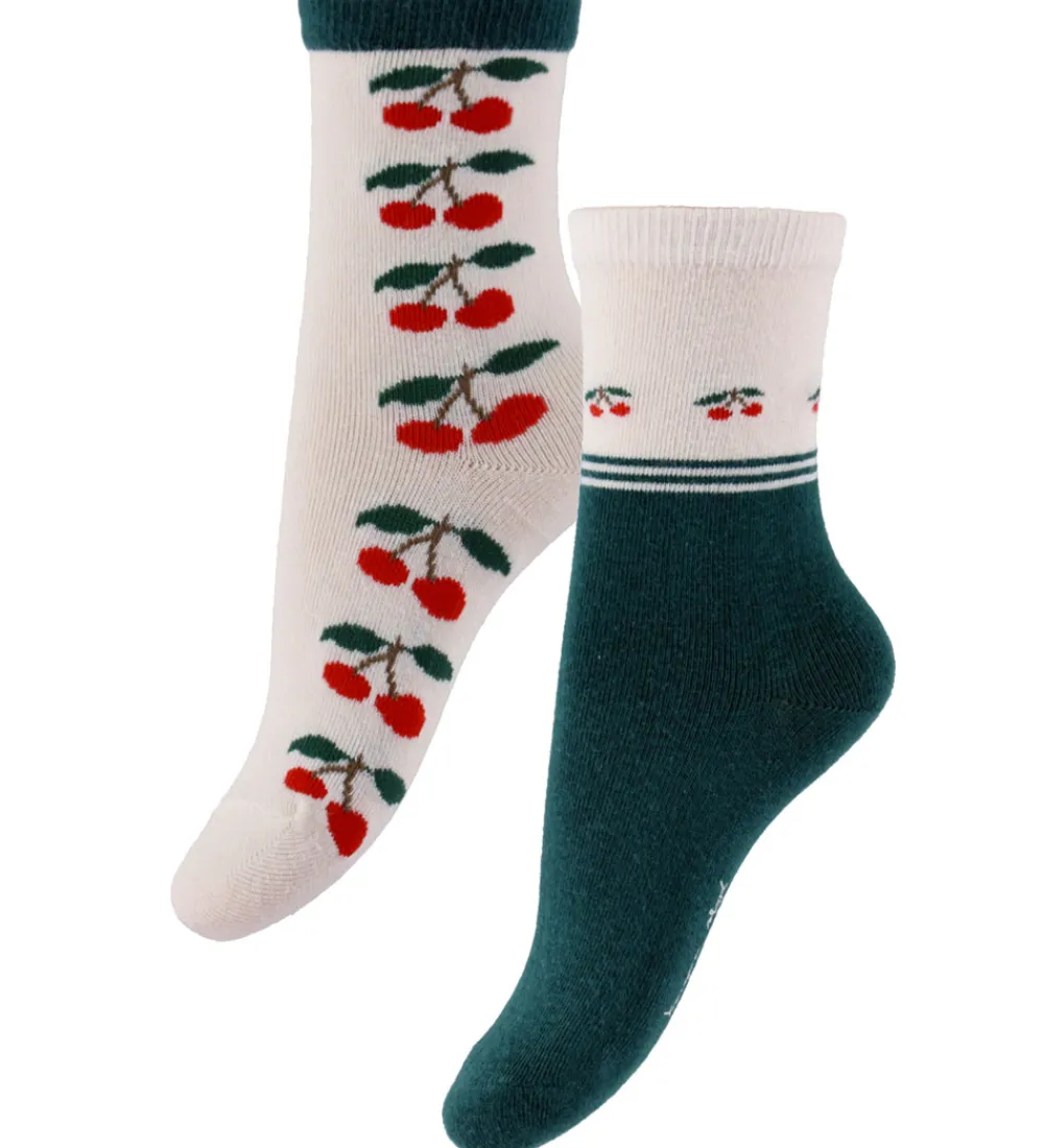 Charmerende Konges Sløjd strømper i en 2-pak med et par i hvid med røde og grønne kirsebær samt et par i mørkegrøn med en hvid top og små kirsebær. Strømperne har en god pasform med ribkant øverst, som sikrer en behagelig pasform. Konges Sløjd strømperne er fremstillet i et blødt og strækbart materiale.