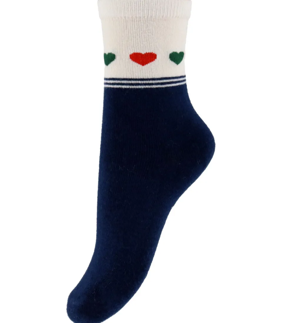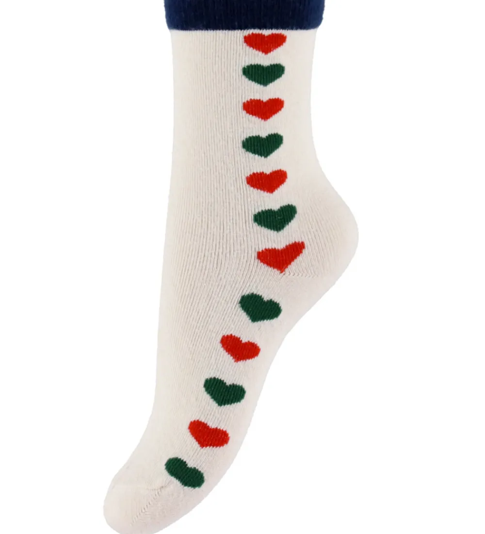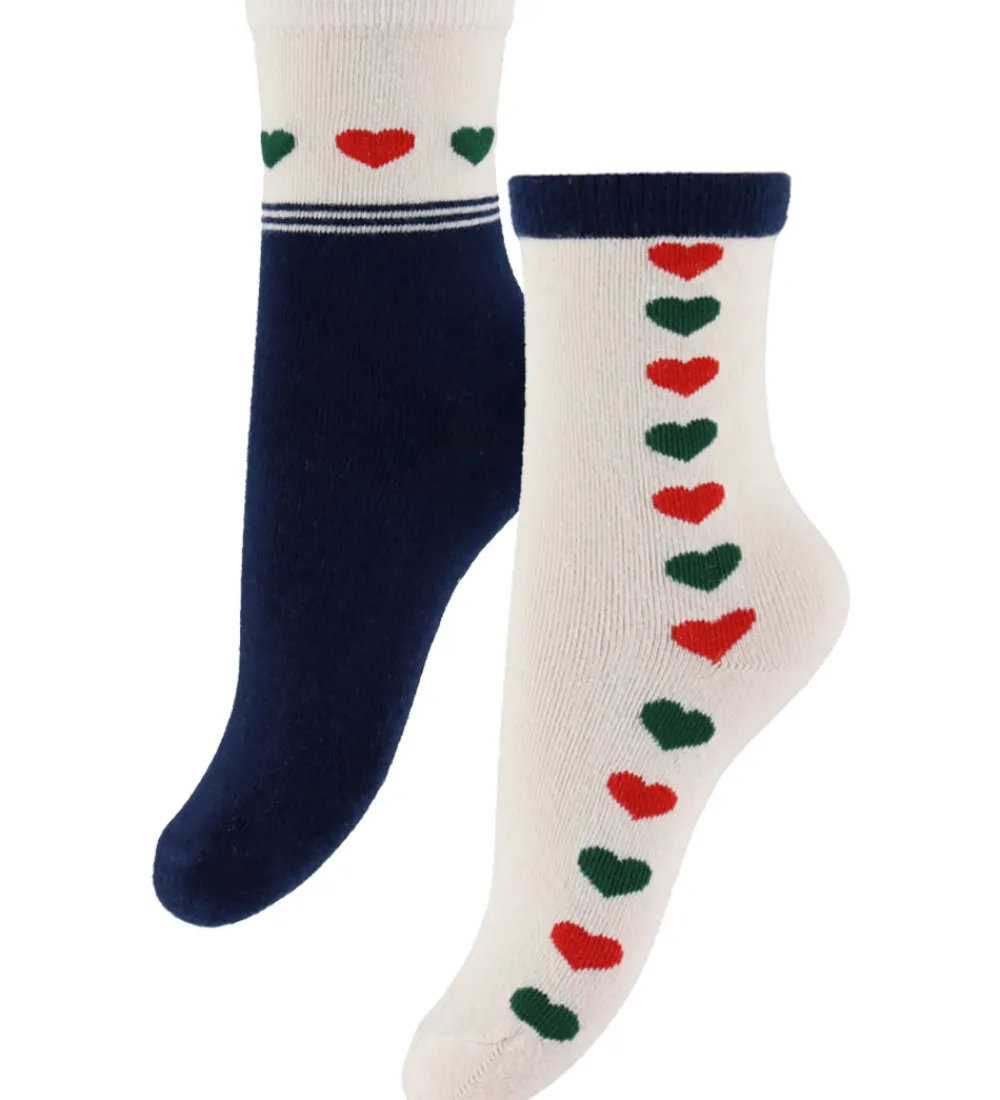 Elegante Konges Sløjd strømper i en to-pak med forskellige designs. Ét par er navyfarvet med en beige top prydet af røde og grønne hjerter og vandrette linjer. Det andet par er cremefarvet med en række røde og grønne hjerter ned langs siden. Begge par har en elastisk kant øverst.