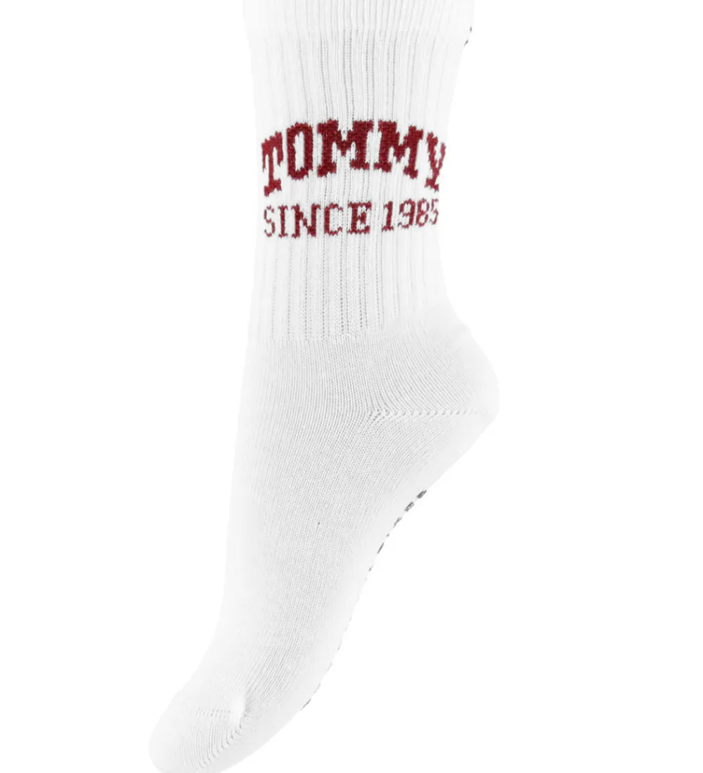 Klassiske Tommy Hilfiger strømper i en 2-pak med hvid farve. Et par har et stort Tommy-logo i blå det andet i rød. Tommy Hilfiger strømperne har ribstruktur på skaftet. Designet sikrer en god pasform og et stilfuldt look.